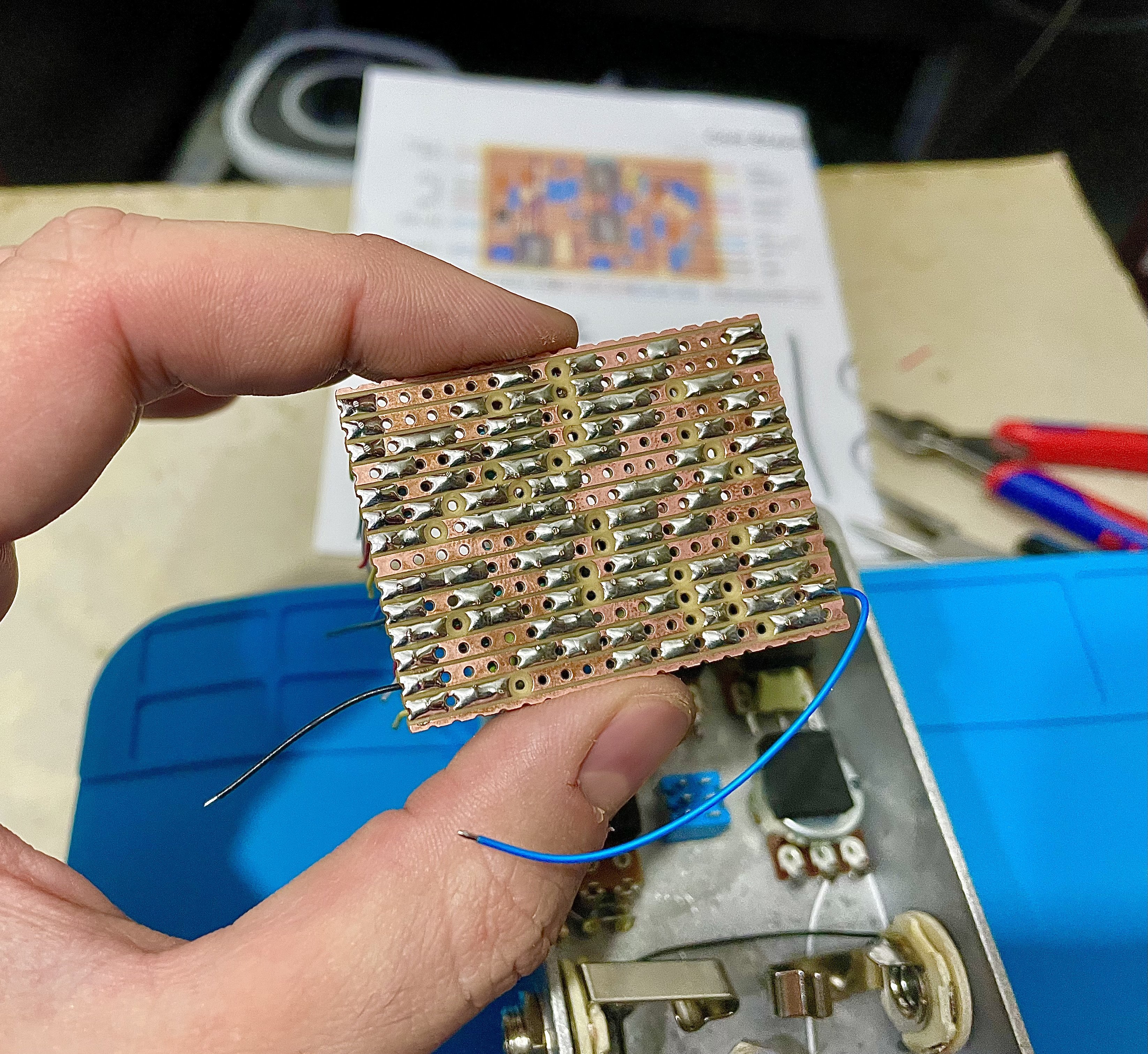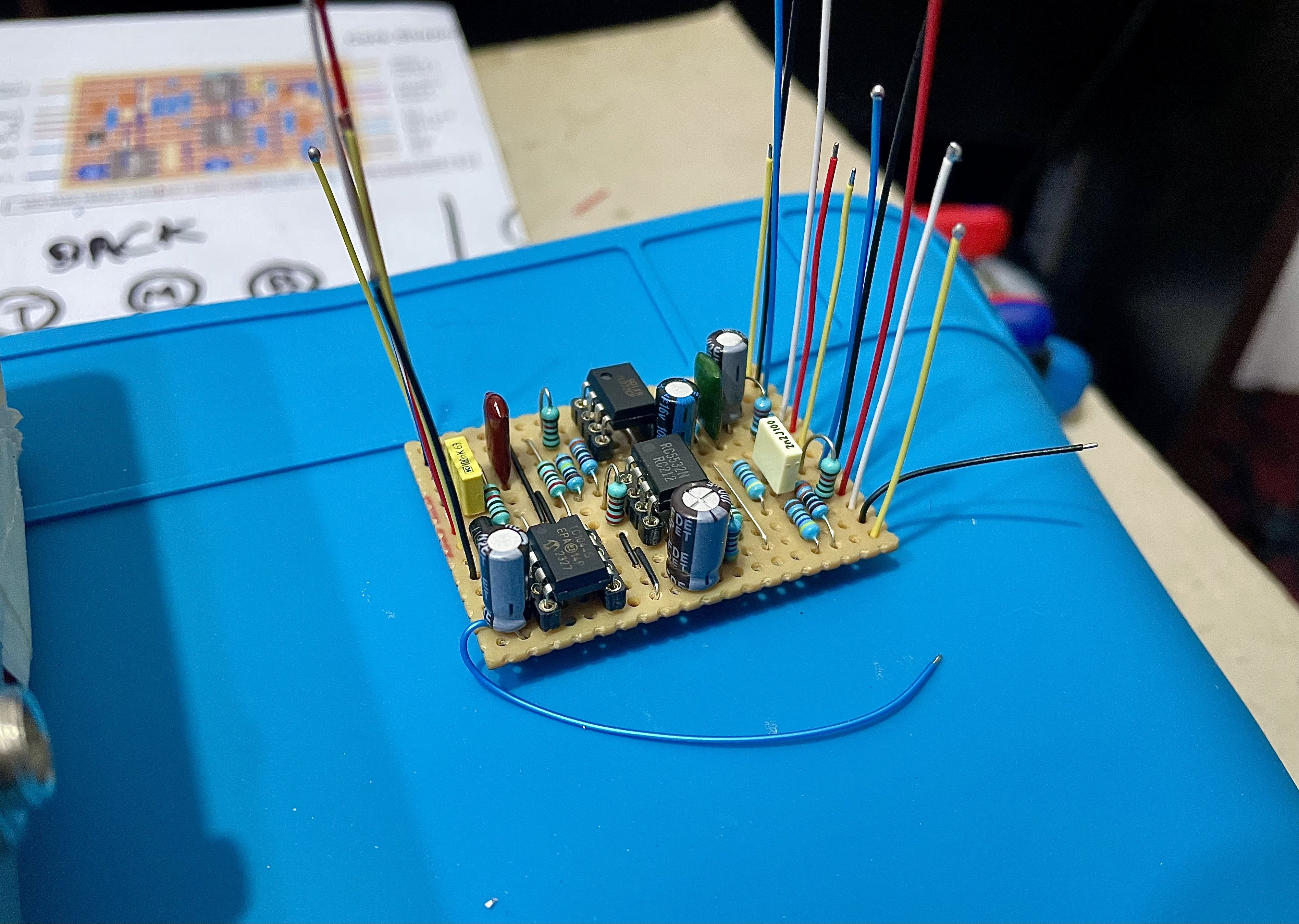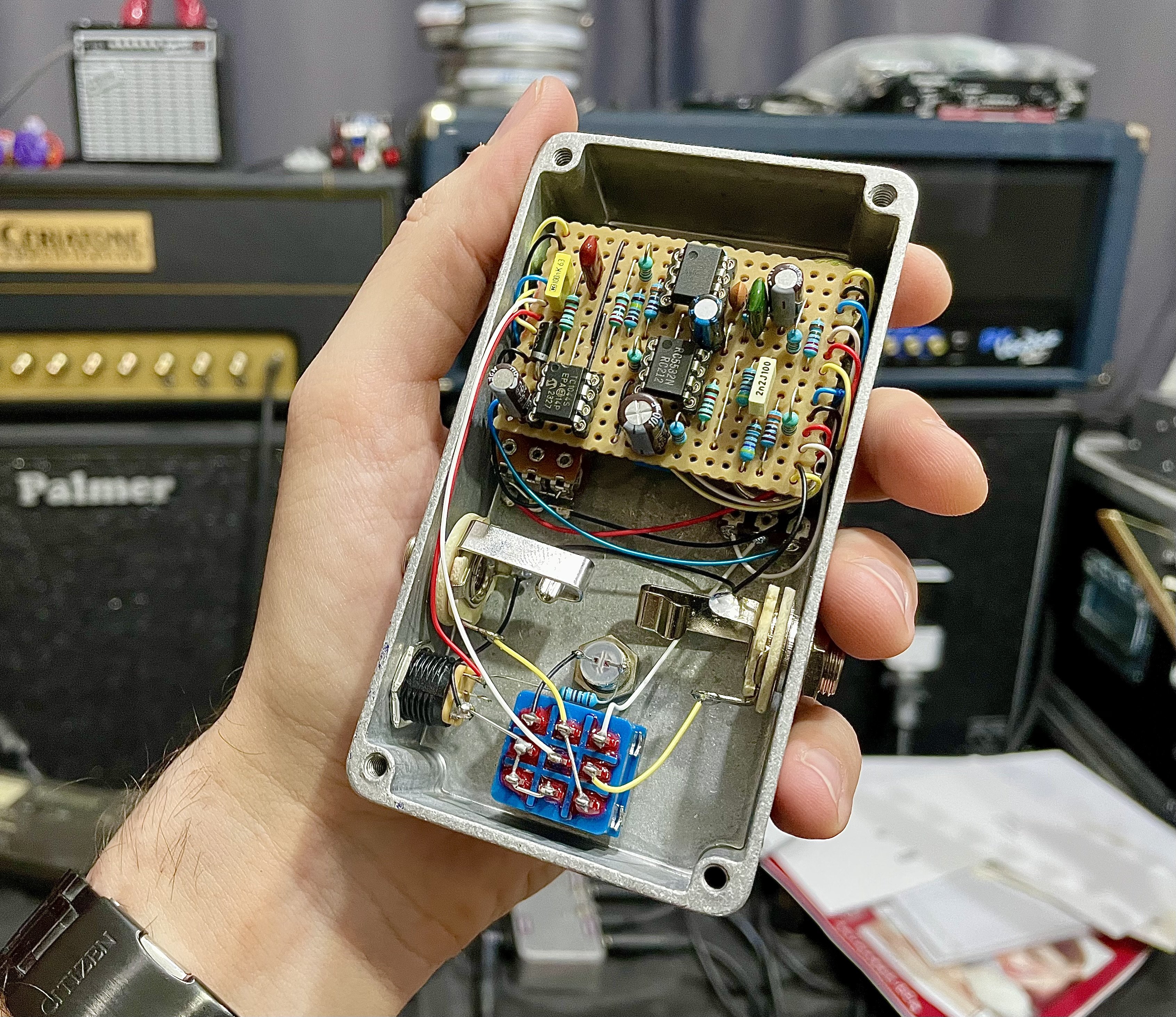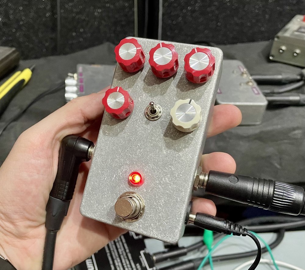* HGE Contraptions Core Shaper EQ clone (167th pedal built) Will most likely use two hifi OPAMPS when I have them instead of the 5532 and 072 (SMD adapted to THT, with the OPA1678 IC -> lower noise and clearer) This is a parametric mid frequency eq (Mid knob + Mid Frequency knob), which also has Bass and Tone controls. Can also be used as a booster of sorts, in conjunction with the Volume knob. In detail, the gain is +-16dB, the frequency sweep is about 300 to 3.3K, the Q is 2.4 in HI and 1 in LO. The beauty of this circuit is that the Q stays constant across the whole sweep and so does the gain. Before this, there's a low gain input stage which gives a strong input signal and buffers the input while avoiding clipping at guitar levels throughout the circuit. The charge pump helps with the headroom, providing a +-9V supply so the boost levels can be reached without problems. Following the bandpass, there's a very standard Baxandall 2 band EQ to take care of low and high frequency and add quite a lot of flexibility to the circuit when combined with the bandpass.