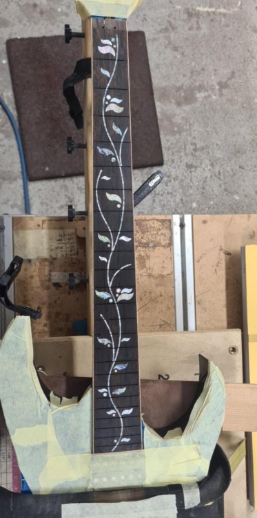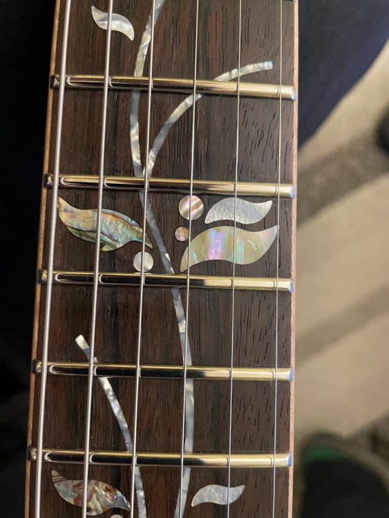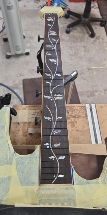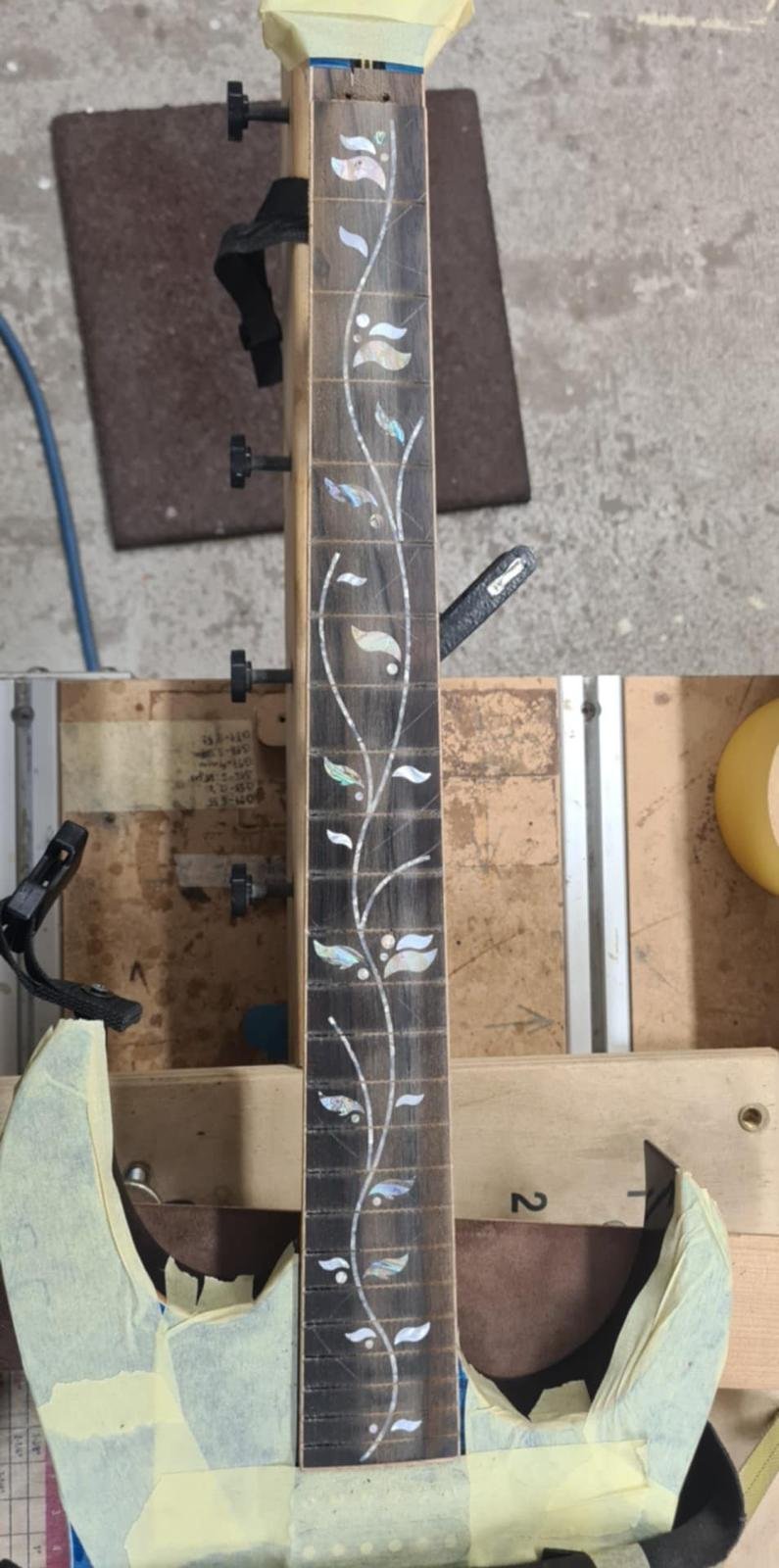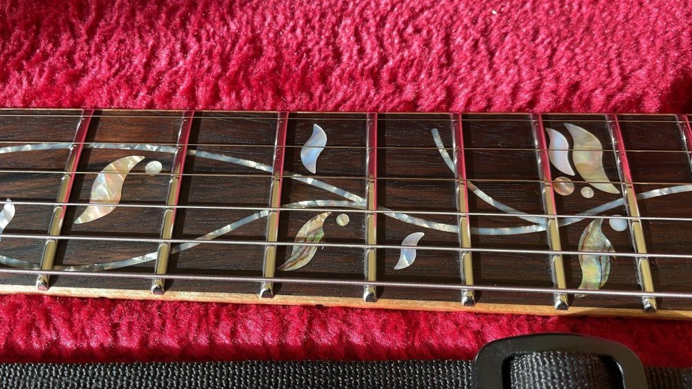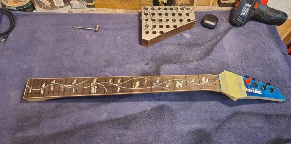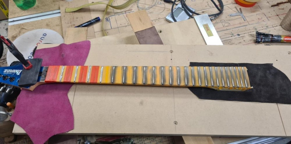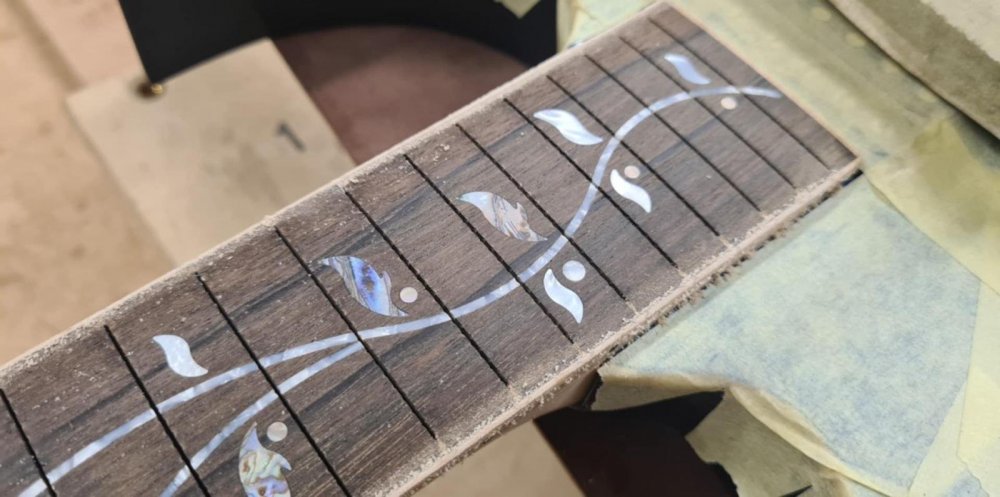 Salutare, Am un Ibanez J custom RG8570Z luat de nou din magazin in 2023. Toate bune si frumoase cu chitara (in principal), dar dupa achizitie si set-up dupa cum imi place mie, am observat mici chestii care ma enervau la ea (desi probabil nu le-ar fi bagat nimeni in seama). Am decis sa ma apuc sa masor pe ea chestii precum: Radius fretboard, si radius tremolo (Ibanez Edge Zero - cel scump, nu Edge Zero II). Dupa masuratori am observat urmatoarele: radiusul, desi pe specificatiile de pe website-ul Ibanez este de 16,9" (standardul Ibanez), pe chitara mea varia intre 15"-15,5". Mai mult radiusul tremolo-ului este de 20" din fabrica. De ce au pus asa combinatie, nu inteleg. Problema cu diferentele astea e ca cele doua corzi Mi/E erau mai sus decat celelalte. Mie-mi place actiunea joasa, sub 1mm. Chitara avea sustain din fabrica, intonatie, totul ok, doar ca mi s-a parut inacceptabil sa fie asa mare diferenta la radius si asa variatiuni. Plus, tastele folosite din fabrica, desi finisate bine la capete si lucioase (pana cand canti pe ele si se oxideaza groaznic de rapid si de urat), ele sunt dintr-un material destul de ieftin, fiind aceleasi puse pe modelele Ibanez premium (am un Ibanez Andy Timmons care a fost retastat tot de Augustin, si a avut aceleasi taste din fabrica ca si J custom-ul asta). Spre exemplu, am si un RG550 Genesis Japan si are alte taste, ca si cele de pe Prestige-urile care nu au stainless steel (mult mai bune si materialul e mai dens). Pana aici 2 mari minusuri la o chitara de 15.000 RON (desi la cumparare, fara set-up, etc nu iti dadeai seama - ei o seteaza din fabrica cu actiune de 2mm & neck relief mare - sa compenseze pentru eventuale greseli de nivelare a tastelor, etc, actiune inalta la nut si dozele atat de aproape de corzi ca ating corzile - este O PROSTIE) Aici intra in schema Augustin (caruia ii puteti vedea lucrarile aici pe forum). Am trimis chitara la el pentru o retastare si o replanare a fretboardului. Retastarea s-a facut cu taste Jescar Stainless Steel - Profilul 58118. Inainte de retastare l-am rugat sa imi replaneze fretboard-ul si sa ii dea un radius de 20" de la un capat la altul - in mod normal din fabrica trebuia sa aiba 16,9" (cum am zis mai sus). Diferenta intre 16,9/17" si 20" nu se simte si nu se vede cu ochiul liber. Acum radiusul fretboardului este la fel cu cel al tremolo-ului. Colac peste pupaza - fretboard-ul era SUCIT din fabrica - cu jumatatea stanga superioara si jumatatea dreapta inferioara fiind mai plate, iar restul mai curbat - practic pe langa ca radiusul in sine varia..era si curbura inegala intre mariginile fretboardului - se poate vedea intr-una din poze cand incepuse nivelarea si exista zone mai deschise la culoare (unde tamponul incepea sa ia lemn) si unele inchise (unde era lemnul neatins) Dupa nivelare fretboard, Augustin a rotunjit marginile fretboardului sa fie ca din fabrica si comode la mana. Retastarea e facuta cu mare precizie, nu exista puncte in care sa poti sa masori si sa joace ceva. Daca inainte nu se simteau capetele tastelor la mana, acum nici atat nu se simt - e excelent. Actiunea o am undeva intre 0,75-0,8mm la tasta 12, putin sub 1mm la tasta 24. Gatul e 99,99% drept cu un neck relief abia vizibil (mai mult auzi cand masori si atingi coarda intre 2 puncte fixe, decat vezi cum se misca coarda). Actiunea la nut (masurata la tasta 1) este de 0.3mm la Mi-ul gros si 0.2mm la Mi-ul subtire - permite o acuratete a intonatiei foarte mare si de asemenea tensiunea totala e instrumentului e scazuta - corzile se simt "spaghetti" si moi sub degete. Set-up-ul final e facut de mine (cu masuratorile mentionate mai sus - preferinta personala pentru stilul meu si capacitatile de control a notelor, etc) - dar acesta nu ar fi posibil fara o lucrare de retastare/replanare a unui lutier care stie ce face. Per total, chitara se simte acum ca un " J custom" chiar daca era deja la un nivel inalt. Acum e si mai si. Sustain-ul este excelent, fara buzz, fara note moarte, fara fret-out cand faci benduri incredibil de mari la tastele 17-24. Pun si poze mai jos sa vedeti problemele intampinate si solutionarea lor de catre Augustin. Ca intotdeauna il recomand pentru orice lucrare - stie ce face, e pasionat si lucreaza cu materiale de top. Il puteti gasi aici: https://www.facebook.com/Avatar2100 https://antonioguitars.ro/