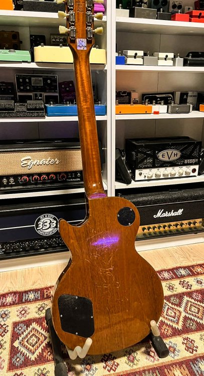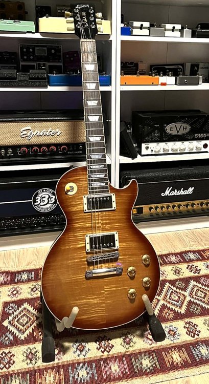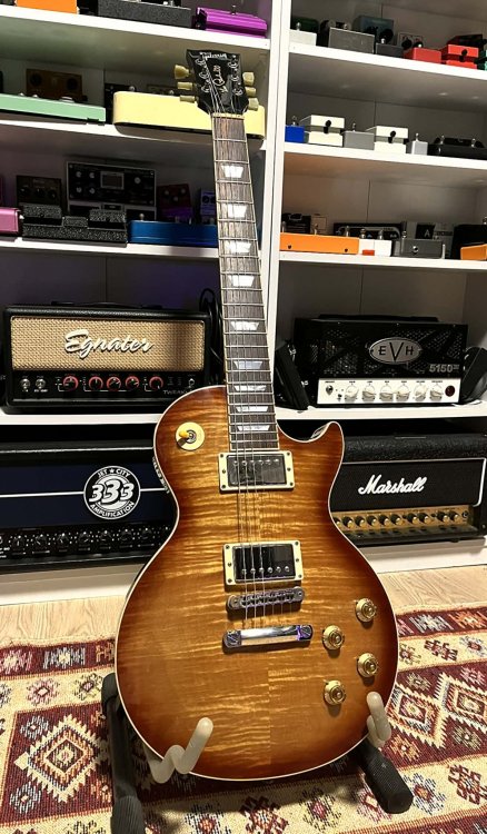 2. Vand un Gibson Les Paul Standard fabricat in USA in anul centenar 2015, de aici si sigla cu 100th Anniversary. Modelul vine si cu bune si cu rele, depinde de ce cauta fiecare. Este reteta clasica, corp si grif mahon, top flamed maple si 2 doze Burstbucker Pro splitabile prin potentiometrii push pull. Ca o particularitate a modelelor din 2015 vin cu nut din bronz, holograma lui Les Paul pe spate, logo 100th Anniversary si controversatul sistem de acordaj automat, care in multe cazuri face mai multe probleme decat ce ar trebui sa faca. In cazul acestui instrument a fost schimbat cu un set de mecanisme de acordaj clasice de cea mai buna calitate, respectiv Gibson Deluxe, model folosit si pe Standardul actual. Griful se simte bine in palma, tastele sunt in stare foarte buna, fara urme vizibile de uzura, este setata impecabil de un lutier cunoscut si apreciat. Are pe spate urme de la curea, dar nimic grav, in rest zgarieturile acelea fine de praf in nitro. Este un Les Paul reusit, foarte frumos si care face foarte multe tonuri bine, este un rock'n roll machine. Va face pe cineva foarte fericit, eu am lasat nostalgia in urma si am trecut la chitari mai moderne. Vine insotita de hardcase-ul original Gibson. Modelul de Standard ctual este in jurul a 13000 lei la Thomann, doresc pe acest exemplar care a imbatranit precum vinul timp de 10 ani 9000 lei. Nu doresc schimburi decat cu apartament cu 3 camere ultracentral/ https://www.thomann.de/ro/gibson_les_paul_standard_50s_hcs.htm?atr=true Contact 0731 444 646