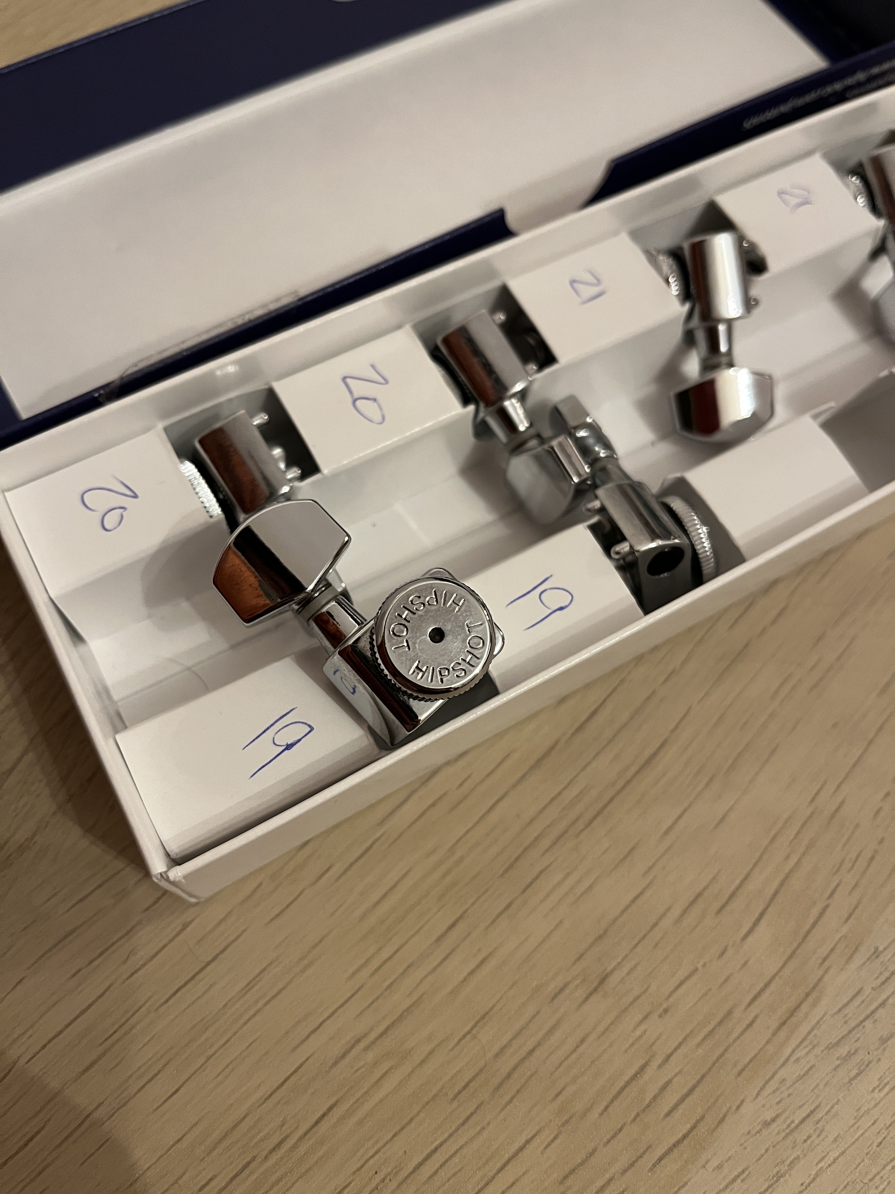Hipshot® tuning machines are one of the easiest ways to get more out of your Fender® guitar. The Grip-Lock™ feature grabs the string tightly for quick re-stringing and superior tuning stability over traditional machines. A 21:1 tuning ratio makes it easy to dial in the precise pitch without overshooting. Best of all, it directly fits your Fender® two-pin mount pattern so the only tool needed to install these puppies is a 10mm wrench! 21:1 ratio for super fine tuning accuracy Grip-Lock™ pin and thumb wheel system clamps onto your string end for complete tuning stability without string winds around the post Available in staggered and non staggered post Staggered post uses (2) 21mm, (2) 20mm, (2) 19mm post length tuning machines (see instructions for further details) Non staggered post uses (6) 21mm post length tuning machines Directly retrofits the Fender® American Standard two-pin mount system Machines are sold in sets of 6 String post hole fits strings up to .060" (we can enlarge to .090" by special order) Tuners come with Hex buttons by default with lots of button options available Bass side or treble side mounting options Made in Korea