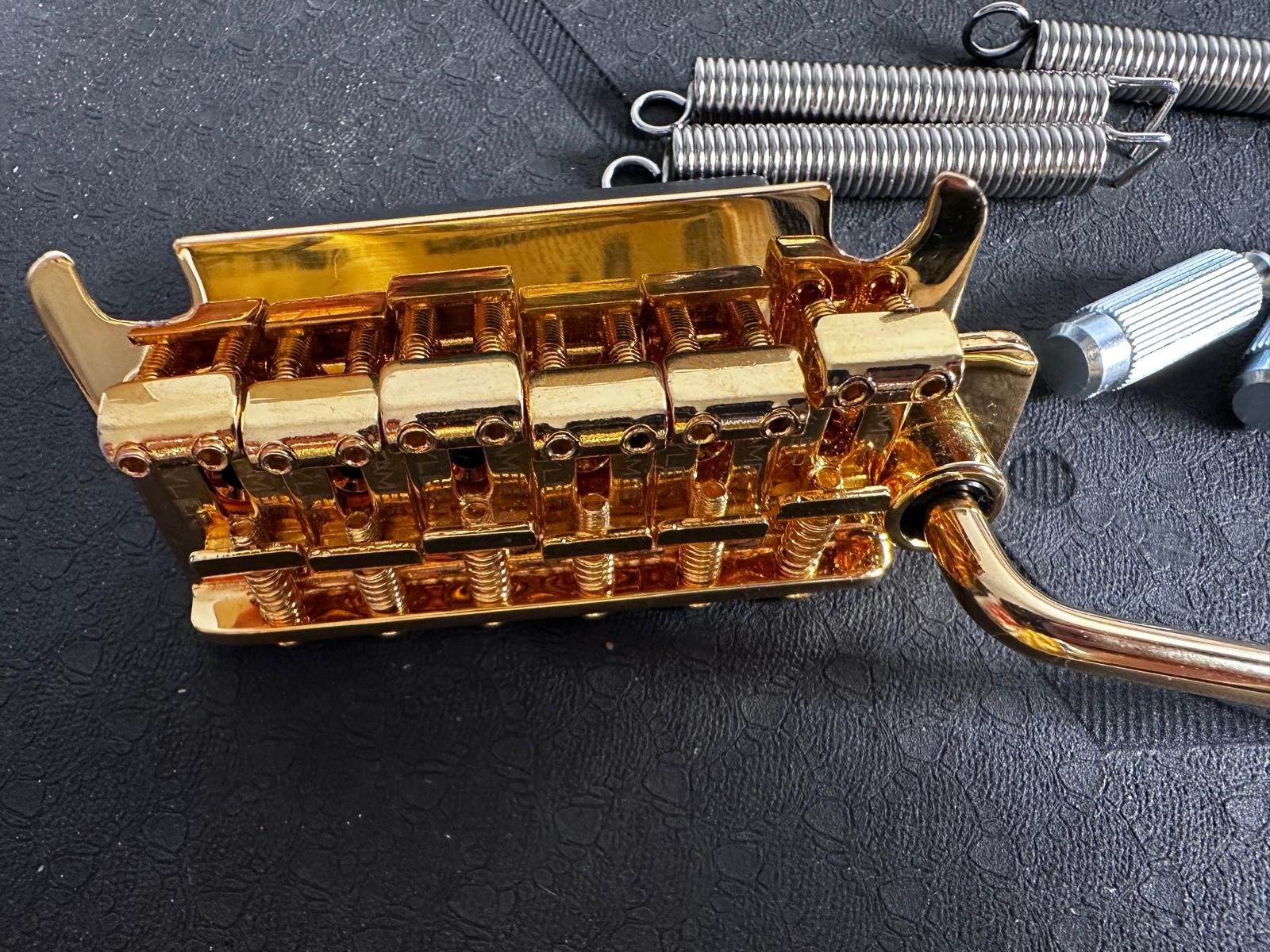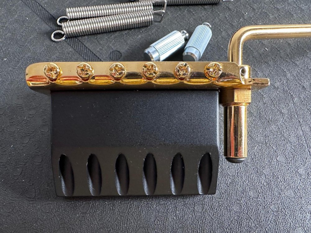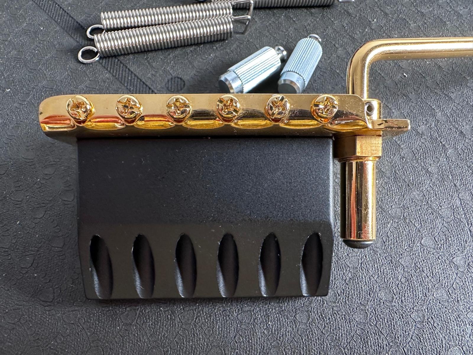 Vând un two-point tremolo realizat sub licență de James Tyler. E echivalentul lui Gotoh 510T-FE1, dar cu vintage style saddles (10.8mm). Mi-am comandat un Gotoh pe negru și nu mai am nevoie de acesta. Vine cu arcuri, anchor points (chrome) și claw bar Gotoh. Sunt cele cu care a venit bridge-ul meu negru, dar nu le-am mai montat pe chitară, pentru că sunt identice.