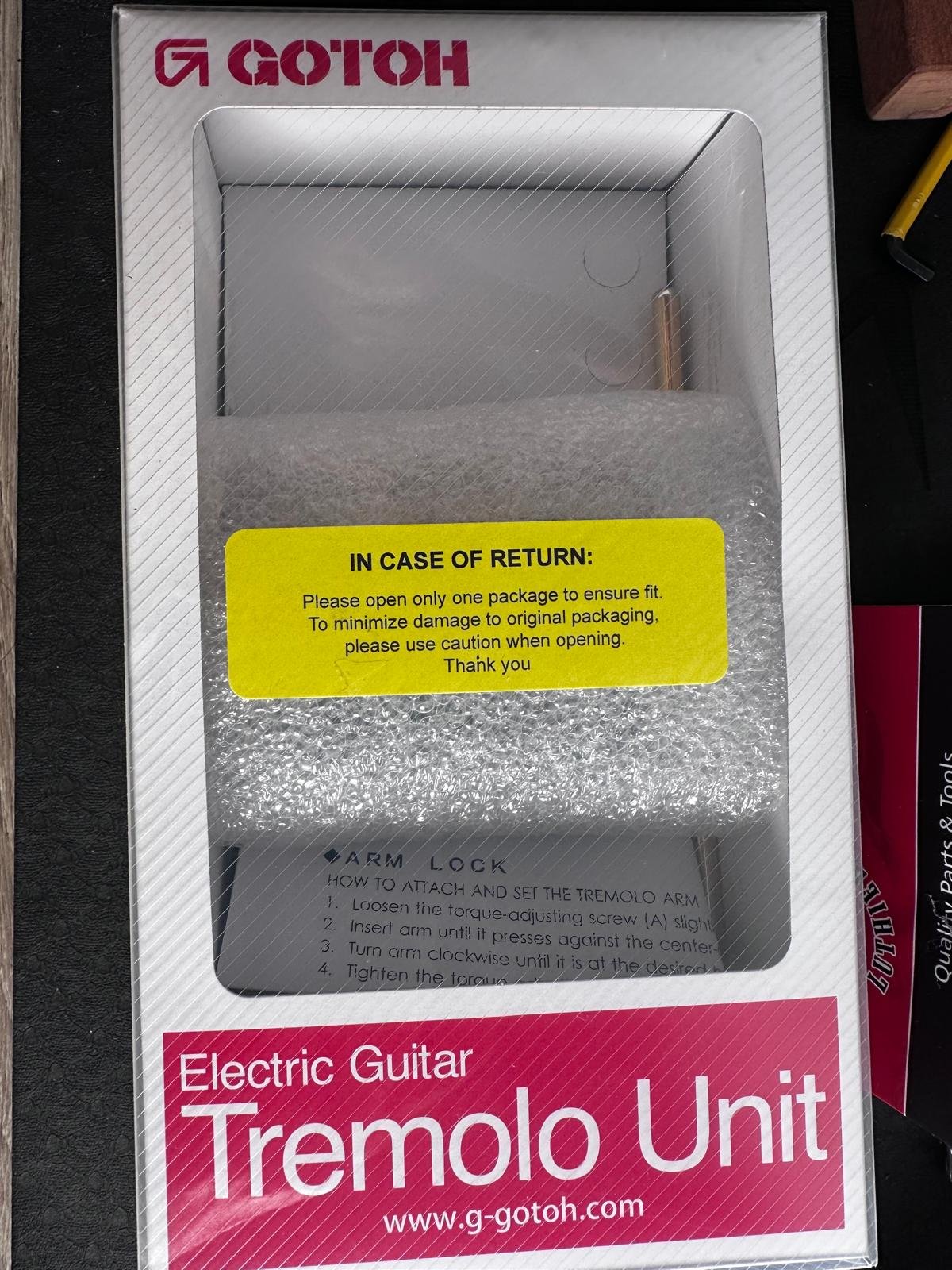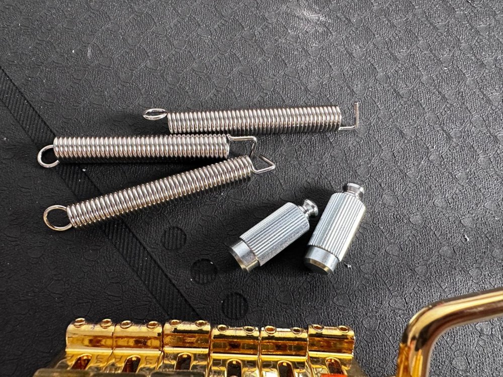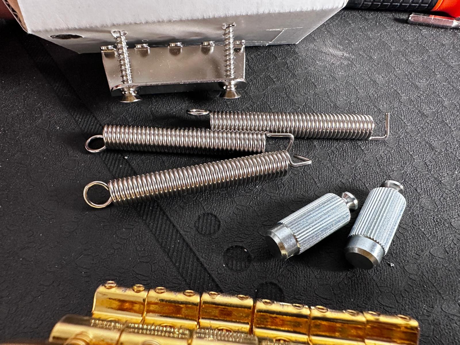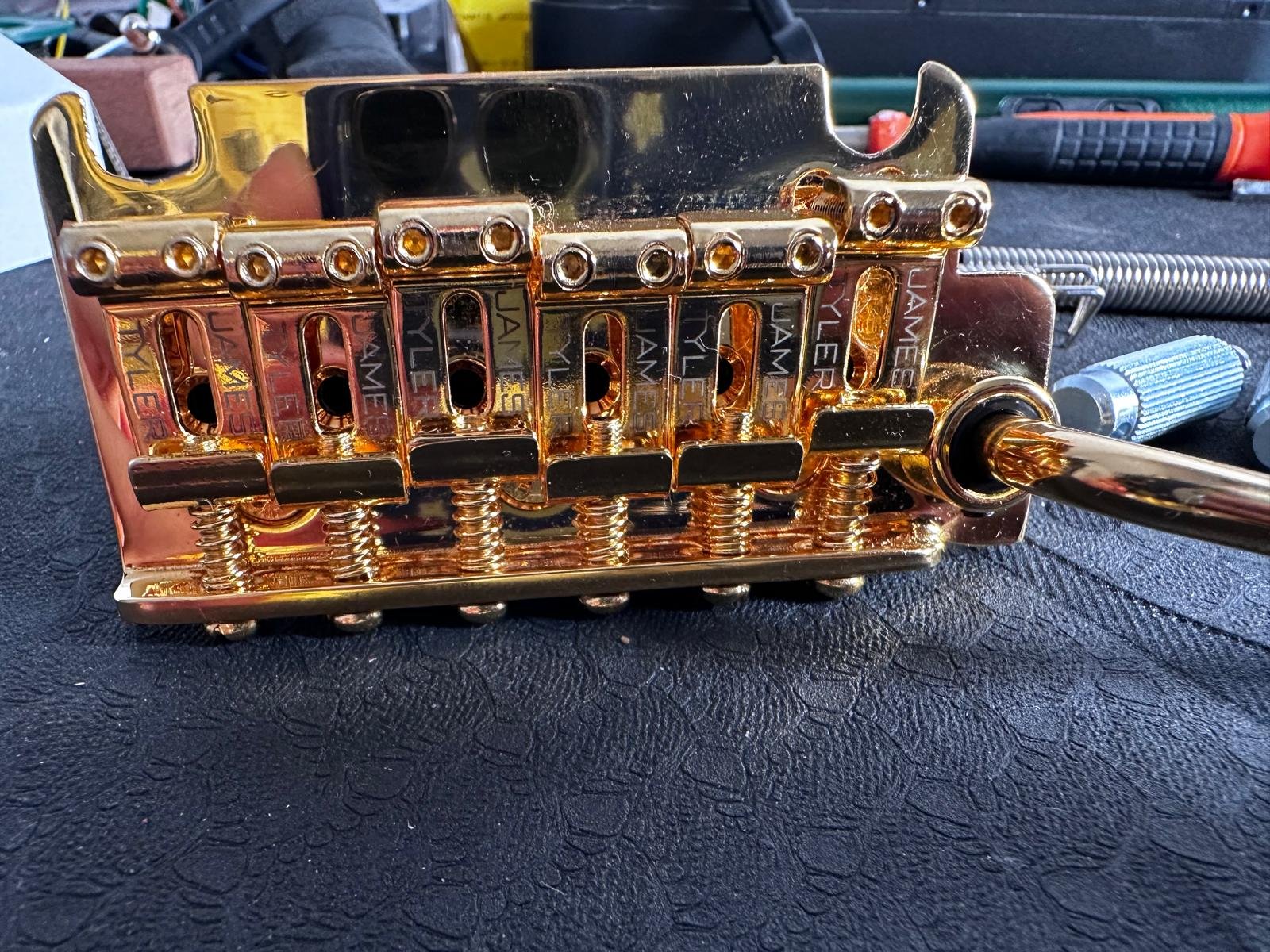 Vând un two-point tremolo realizat sub licență de James Tyler. E echivalentul lui Gotoh 510T-FE1, dar cu vintage style saddles (10.8mm). Mi-am comandat un Gotoh pe negru și nu mai am nevoie de acesta. Vine cu arcuri, anchor points (chrome) și claw bar Gotoh. Sunt cele cu care a venit bridge-ul meu negru, dar nu le-am mai montat pe chitară, pentru că sunt identice.