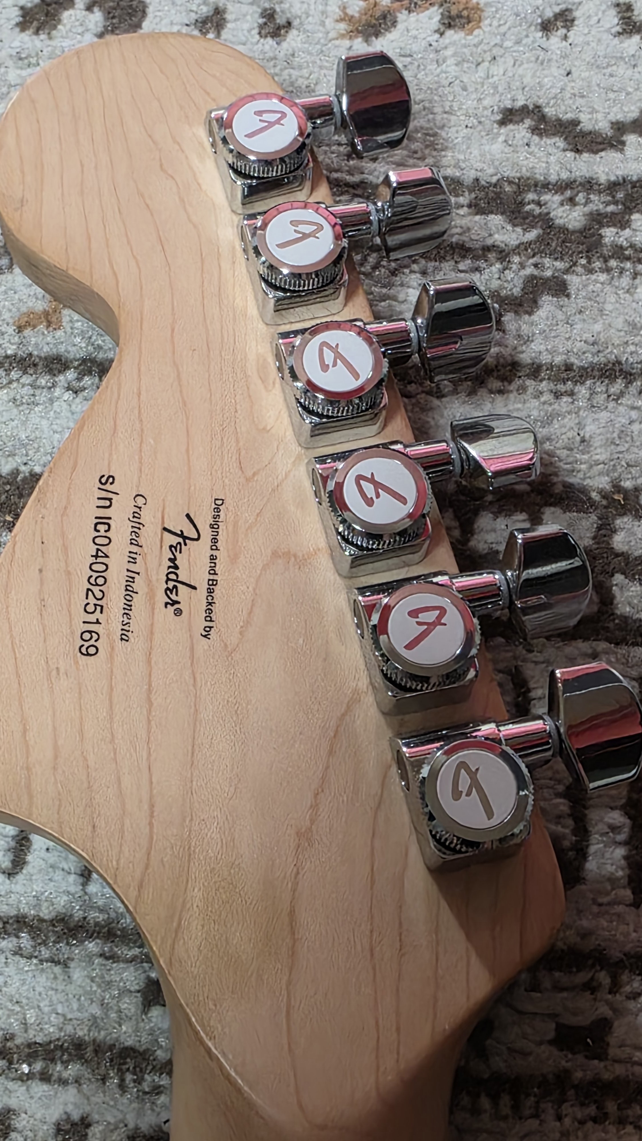 For sale: Fender Standard Stratocaster made in Mexic, an de fabricație 1996, este un strat din prima serie de Standard făcută în Mexic, este model cu corp gros ca la American Standard prin comparație cu următoarele serii de Standard și Player Mexicane care au body-ul mai subțire, gâtul este un C-shape subțire, taste fără uzură, estetic arată chiar excelent pentru vârsta care o are, vine cu upgrade-uri: nut din brass YJM, string tree Graftech, bridge Babicz Full Contact și tremolo Musicilily din brass, are electronica originală CTS-usi și switch perfect funcțională și doze Fender Vintera 50s, se vinde cu husă din piele/înlocuitor pentru piele, pentru safe transport am un big box cu materialele de protecție necesare. Chitara are setup profi, sta foarte bine în acordaj dacă folosești maneta de tremolo. Preț de vânzare: 3000 lei, nu este negociabil, din ce am văzut pe la mica publicitate este cel mai vechi Standard mexican, arată foarte bine, este întreținut, are upgrade-uri, studiați ofertele existente pe piața și vorbim în caz ca sunteți interesați de achiziție. Pentru schimburi doar cu superstraturi sau ceva telecaster dar modele mai vechi (anii 90 sau early 2000) aștept ofertele în privat.