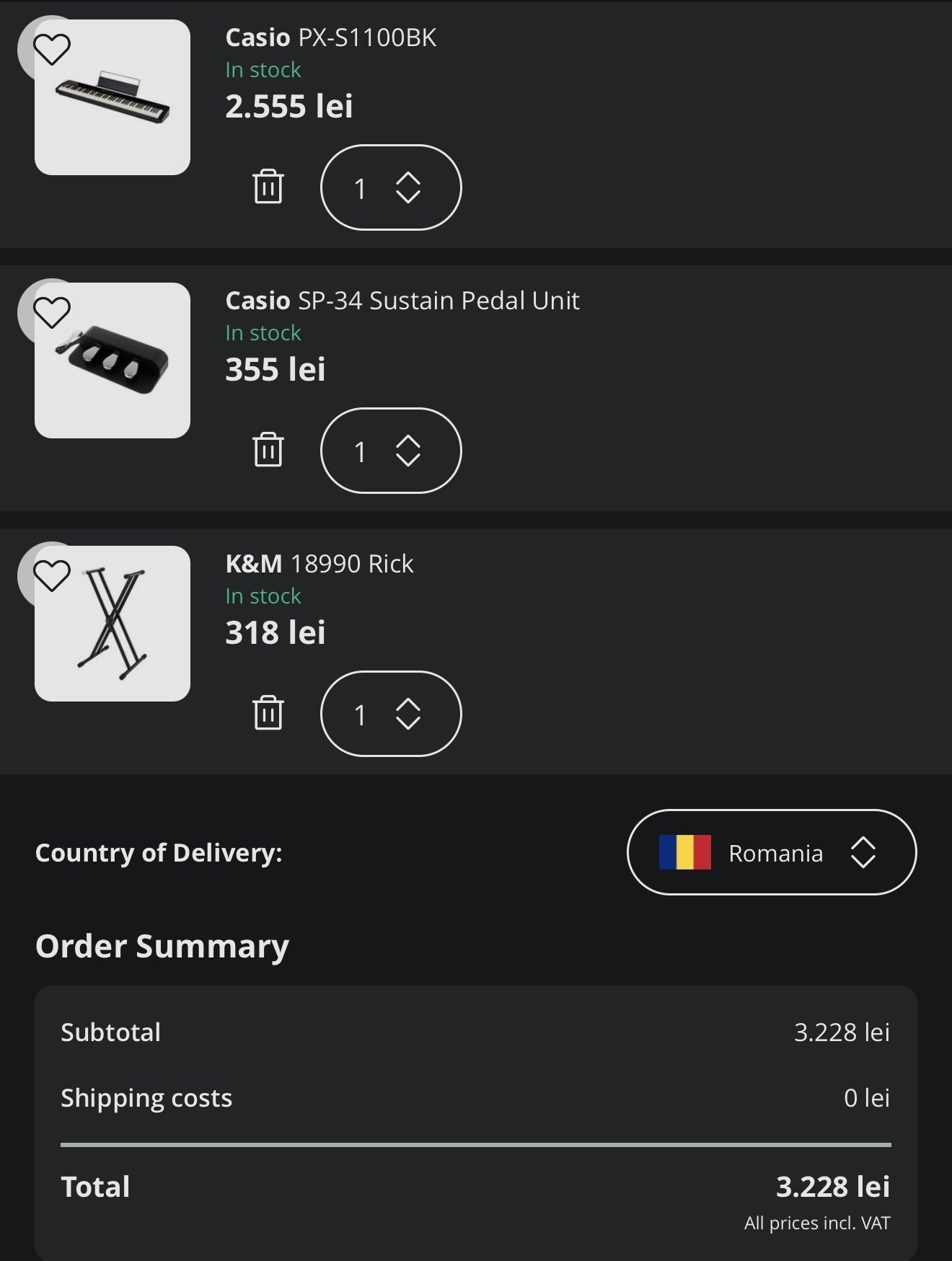 Vand un pian digital Casio Privia PX-S1100 impreuna cu modulul de 3 pedale SP-34 si un stand K&M. Motivul vanzarii e ca nu le folosesc. Aspect si functionalitate 10/10, au fost folosite foarte putin si doar in casa. Predare personala in Iasi sau trimit in tara prin FanCourier, ambalate corespunzator, cu toate accesoriile, pe cheltuiala cumparatorului. Nu accept schimburi!