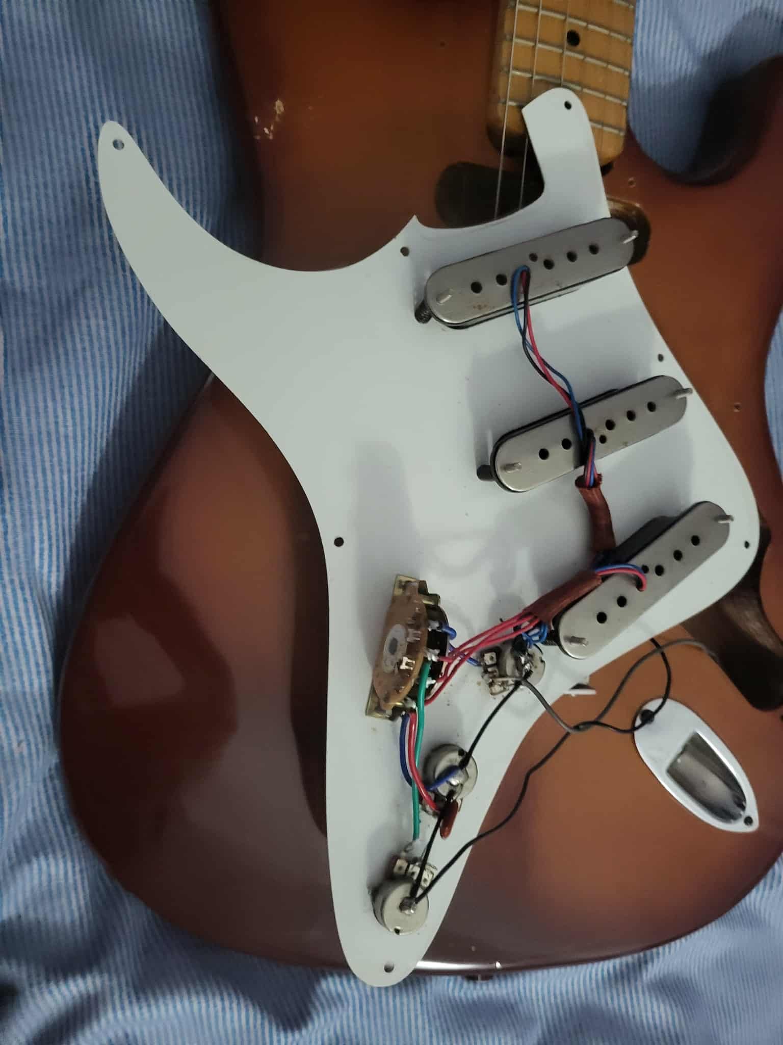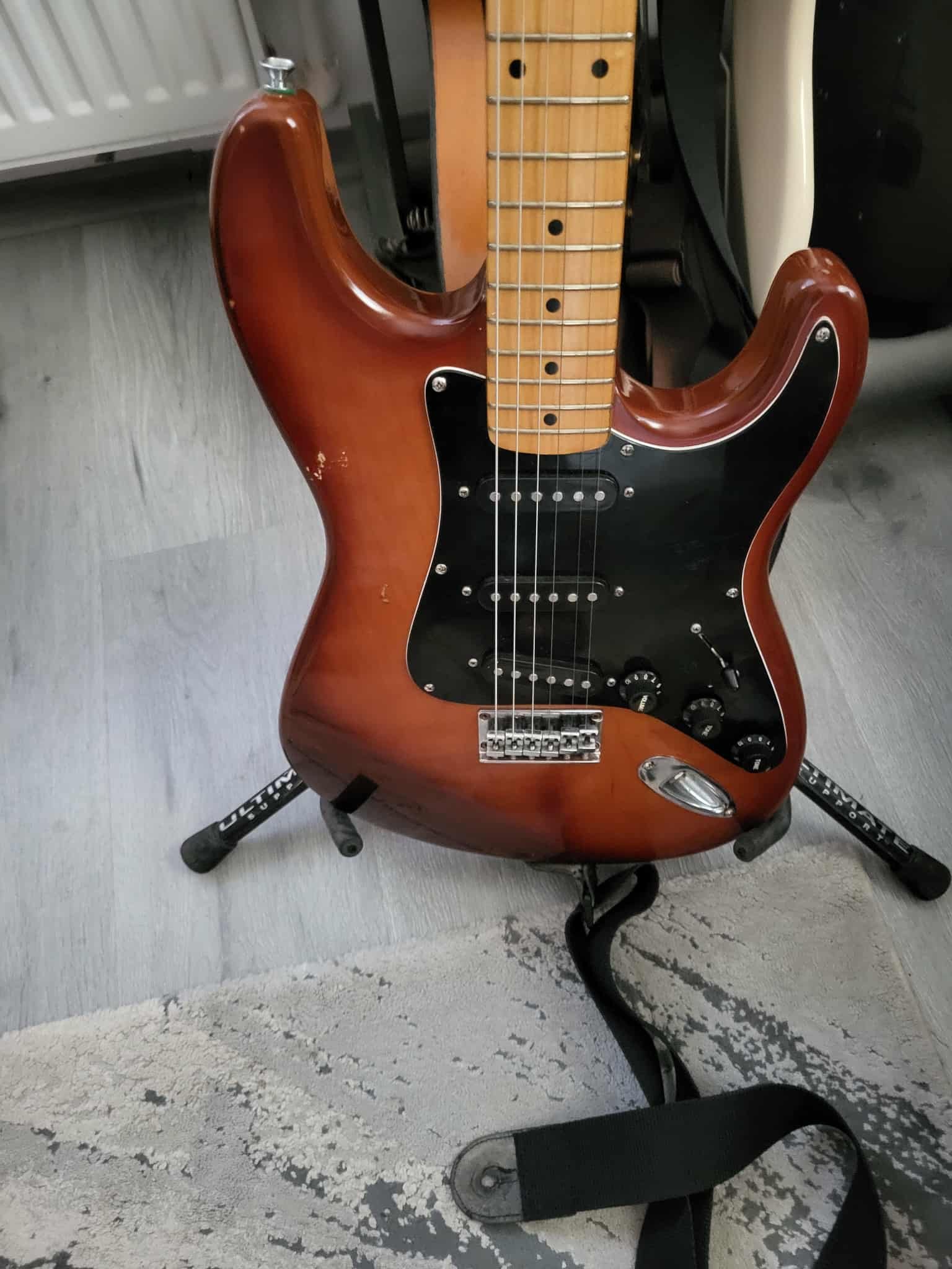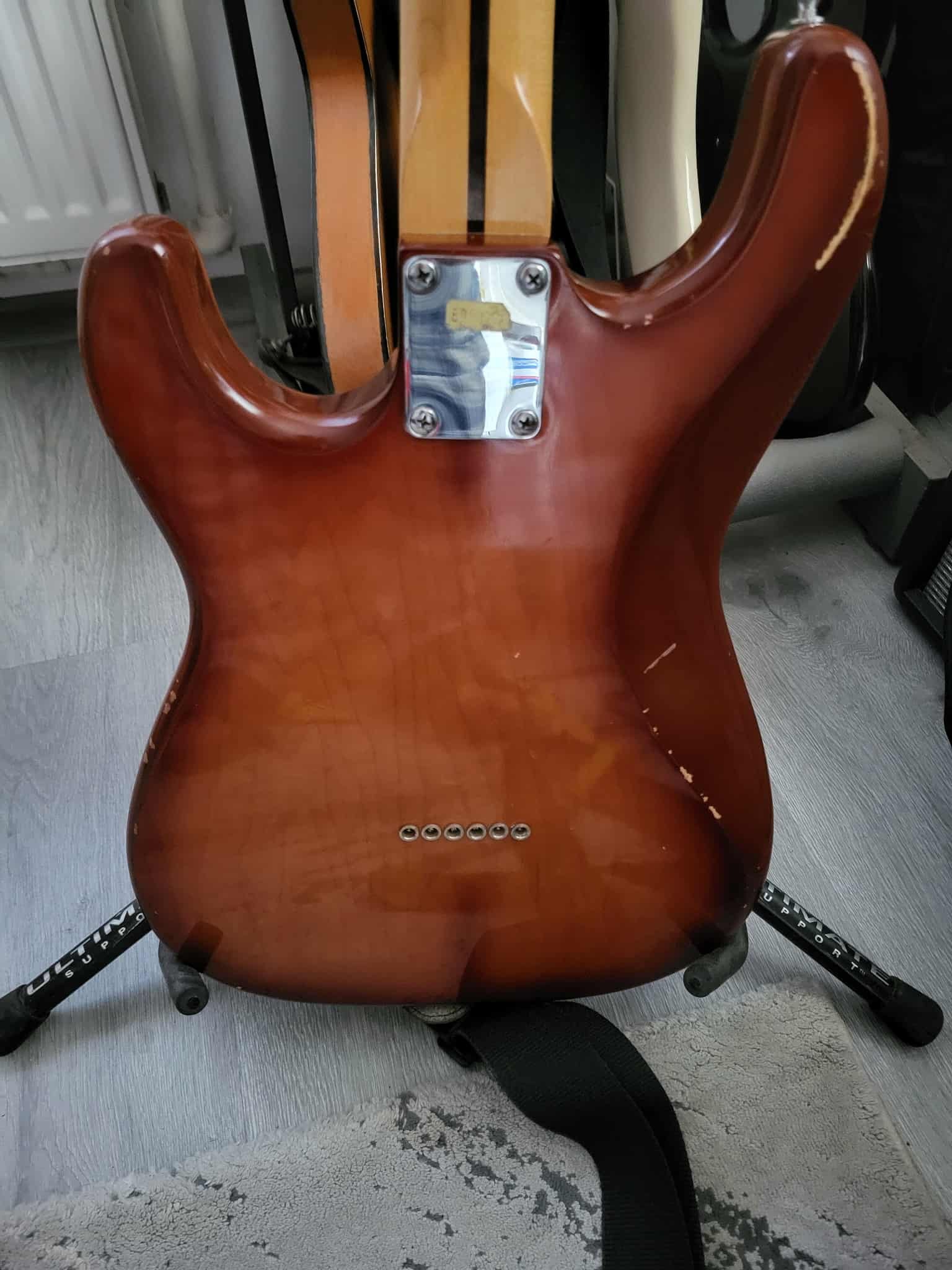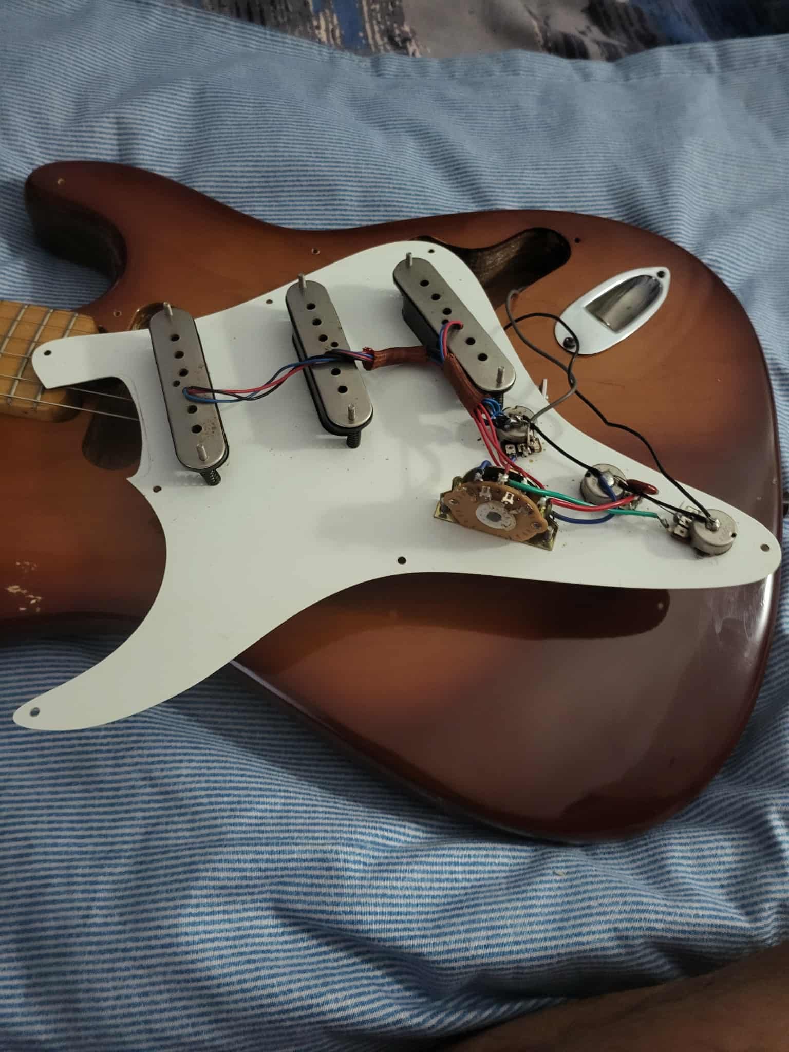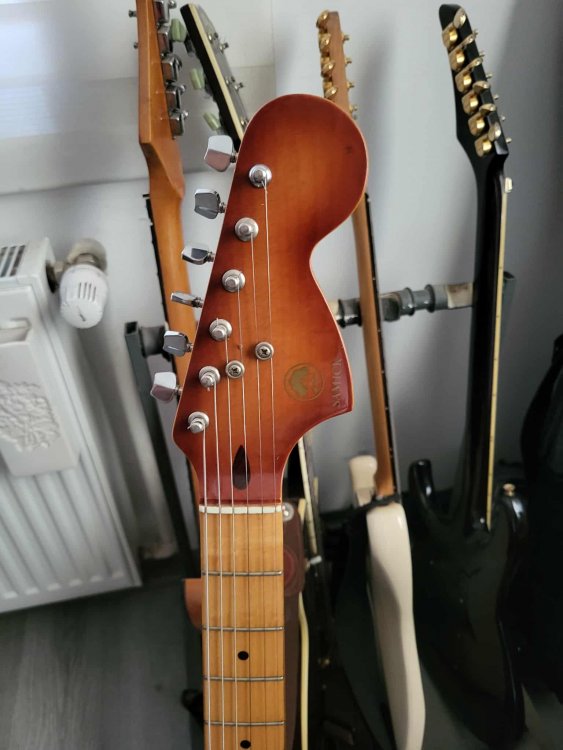 Chitara este facuta la Reghin corp din lenm de paltin si are imbunatatiri :vopsita cu serlac , doze P90 ,bridge, 3 tonuri diferite...