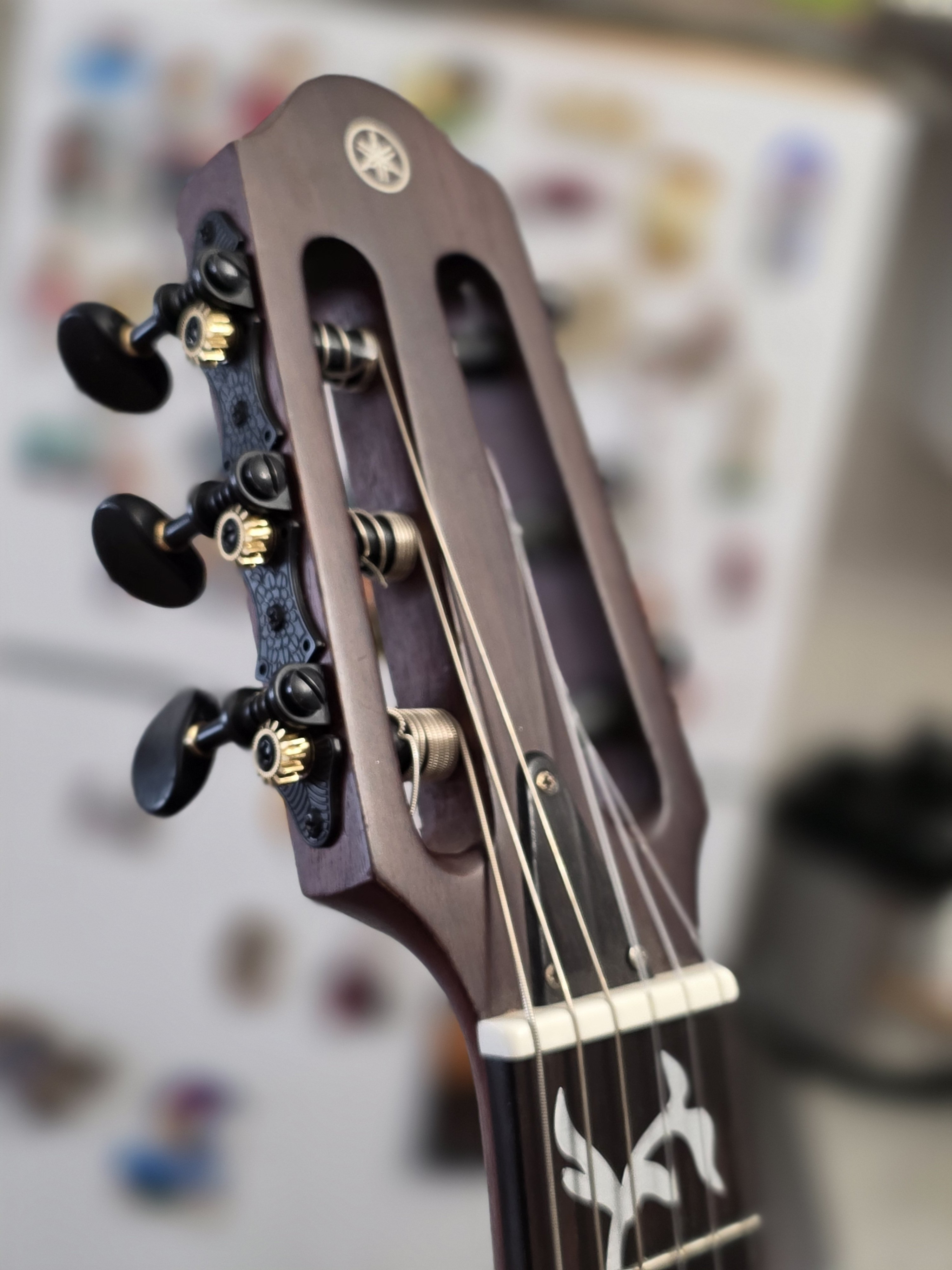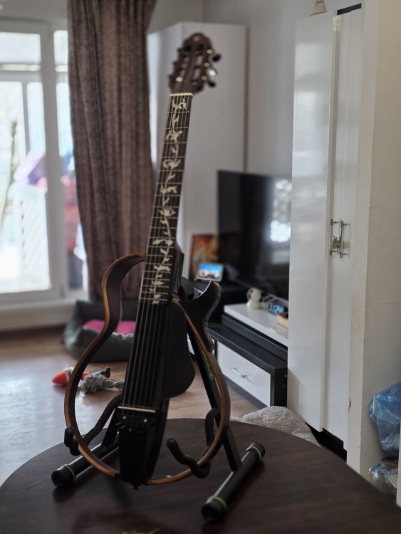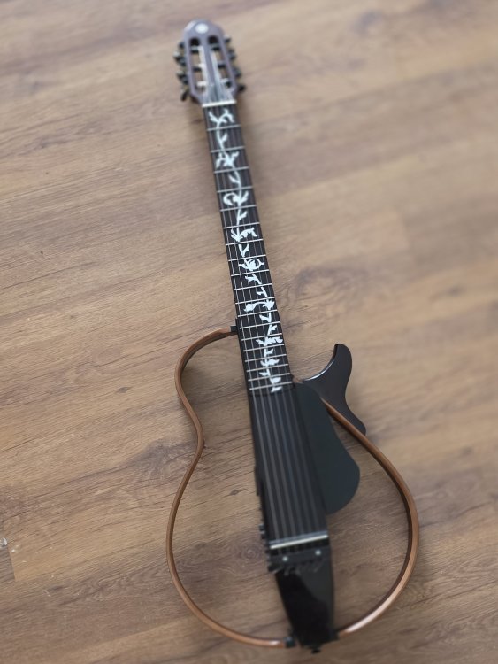 Vand Chitara Yamaha Silent SLG200N (nylon) Pret Magazin: aprox 3800 (soundcreation.ro/chitare-electro-clasice-cid596/yamaha-slg-200n-na-id22946.html) -Corp din lemn de Mahon -Grif din lemn de Mahon -Tastiera din lemn de Abanos (Ebony) -Bridge de Palisandru (Rosewood) -Lateralele din lemn laminat de Arțar/Palisandru (Maple / Rosewood) -19 taste -Lățime prăguș: 52 mm -Scala: 650 mm -Sistem cu doză piezo SRT -Preamplificator SRT Mic Modeling Preamp System (Neumann U67) -Controale: Power, Master Volume, Aux In Volume, Bass, Treble, Tuner, Blend & Smooth Control - -Efecte: Reverb1, Reverb2, Chorus -Cheițe de acordaj aurite cu butoni de lemn (schimbate de mine) -Alimentare cu baterie sau alimentator -Conectori 1x ieșire jack, 1 x intrare aux pentru MP3 cu control pe volum Include husă de protecție