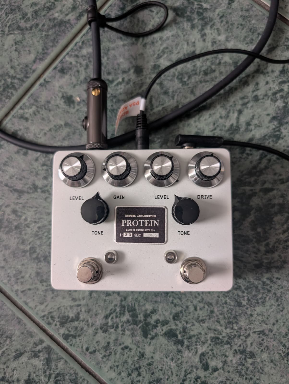 Browne Amplification Protein este o pedala apreciata unanim in acest moment, fiind recunoscuta ca una dintre cele mai reusite pedale dual de overdrive. Partea din dreapta este inspirata din celebru Nobels Natural Overdrive, un overdrive extrem de transparent, care nu schimba caracterul amplificatorului sau chitarii, partea din stanga este una dintre cele mai reusite interpretari ale celebrului Bluesbreaker. Impreuna suna divin partea Nobels face perfect partea de low gain si boost, iar Bluesbreaker-ul are un ton gras si decupat cum numai un Marshall foarte bun poate sa sune. Impreuna au un ton gras si clar, foarte expresiv si cu o dinamica foarte apropiata de un amplificator bun pe lampi. Pedala este in stare foarte buna cosmetic si perfecta functional. Vine in cutia originala. Se gaseste rar la vanzare SH pentru un motiv bun, cine o are o tine. Eu am 2, am nevoie doar de una, deci aceasta este clar in plus. Noua se gaseste la 399 euro. Eu doresc pe a mea 1300 lei. Pretul este FIX si nu doresc nici un schimb. https://www.effekt-boutique.de/browne-amplification-the-protein-dual-overdrive-pedal-v4.html Contact 0731 444 646