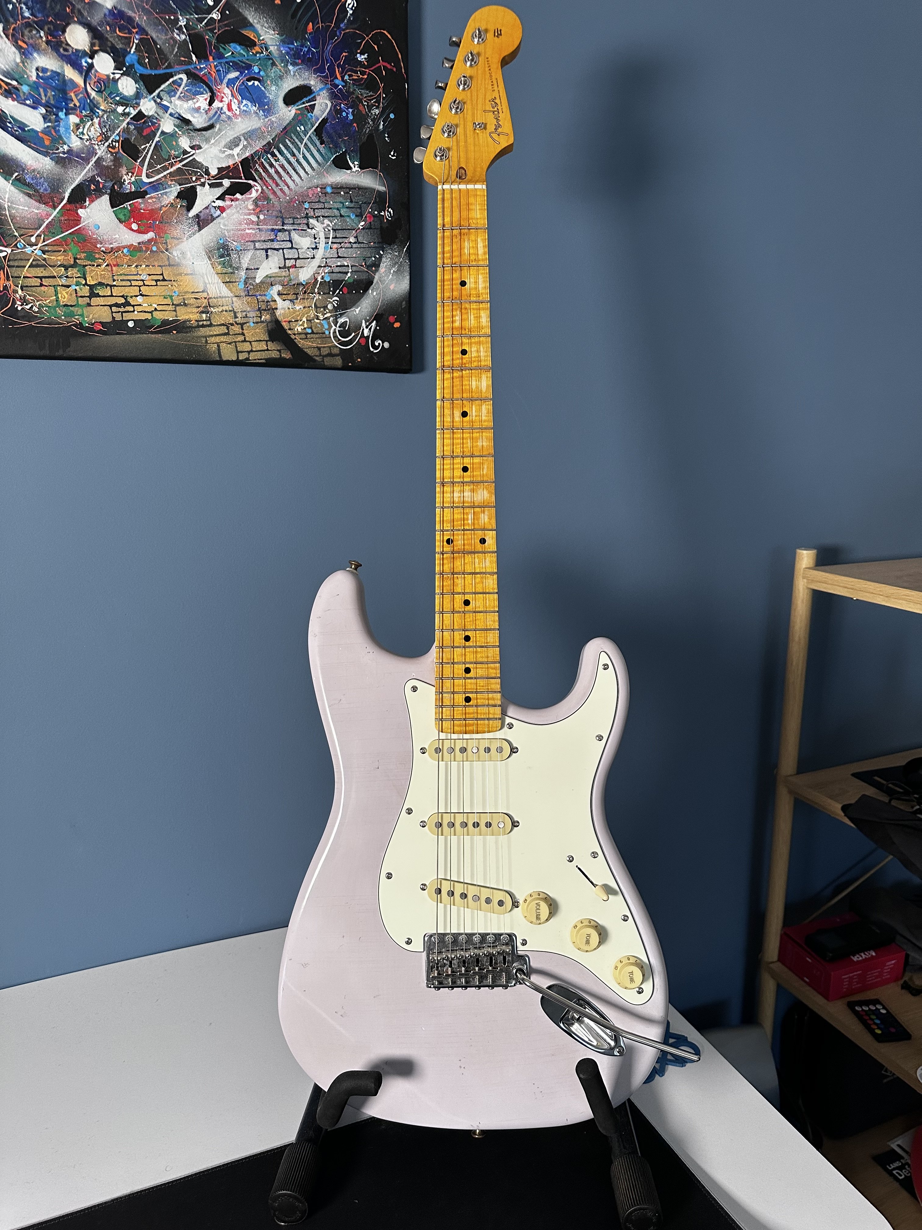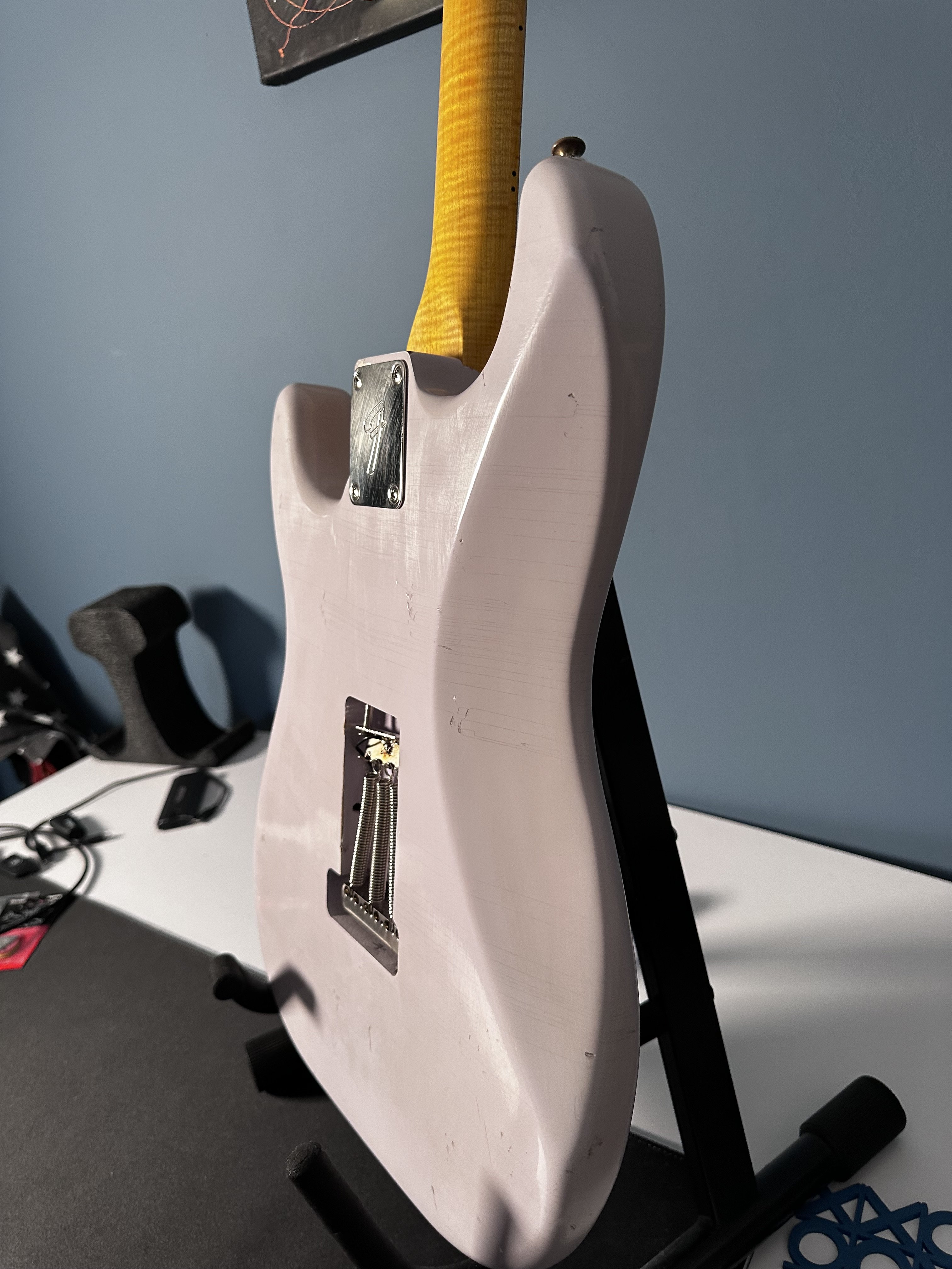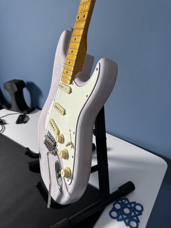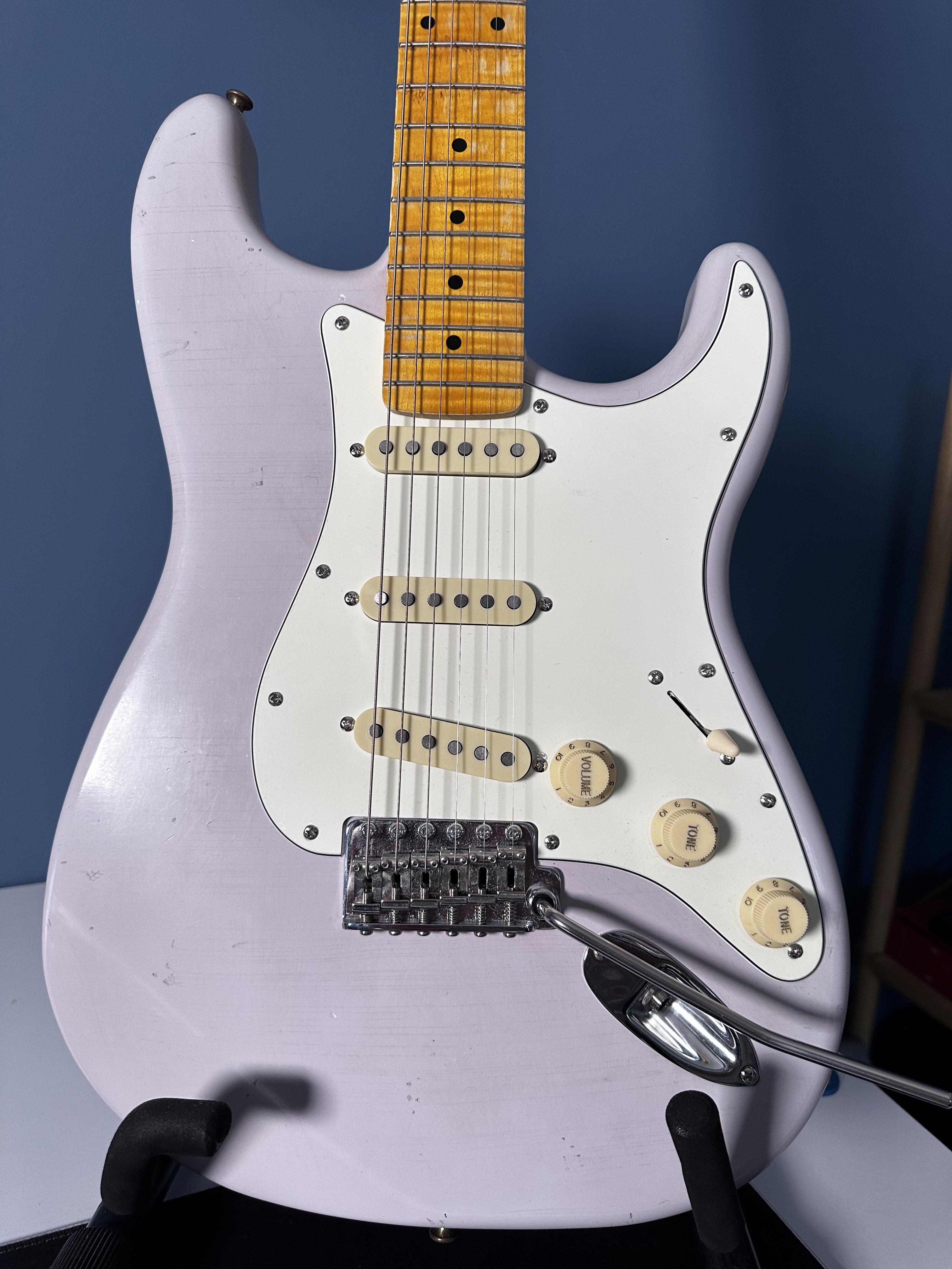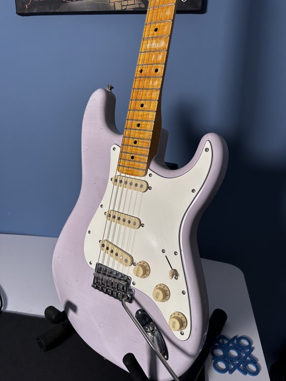 Vând un stratocaster/partcaster deosebit. Culoarea este lila. - corp strat arin (alder) nitro, relic by MJT finishes (Made in USA); - gât flame maple WD music licensed by Fender, nitro, relic, chunky (gros), taste medium, radius 12; - tremolo Gotoh, made in Japan, varianta mai scumpă: 510TS-SF2 - cheițe Fender vintage worn; - neckplate Fender; - doze custom (nu sunt de firmă, dar își fac treaba; dacă vrei ceva de firmă, scrie-mi și vedem ce găsim, prețul va crește însă) Chitara are semne pe tot corpul și pe gât, este relic! Are greutatea de aproximativ 3,4 kg. Sună excelent acustic și amplificată! Prețul componentelor depășește suma pe care o cer eu, nu mai zic de taxe vamale/transport. Nu mă interesează deloc schimburile!6 points