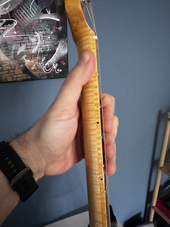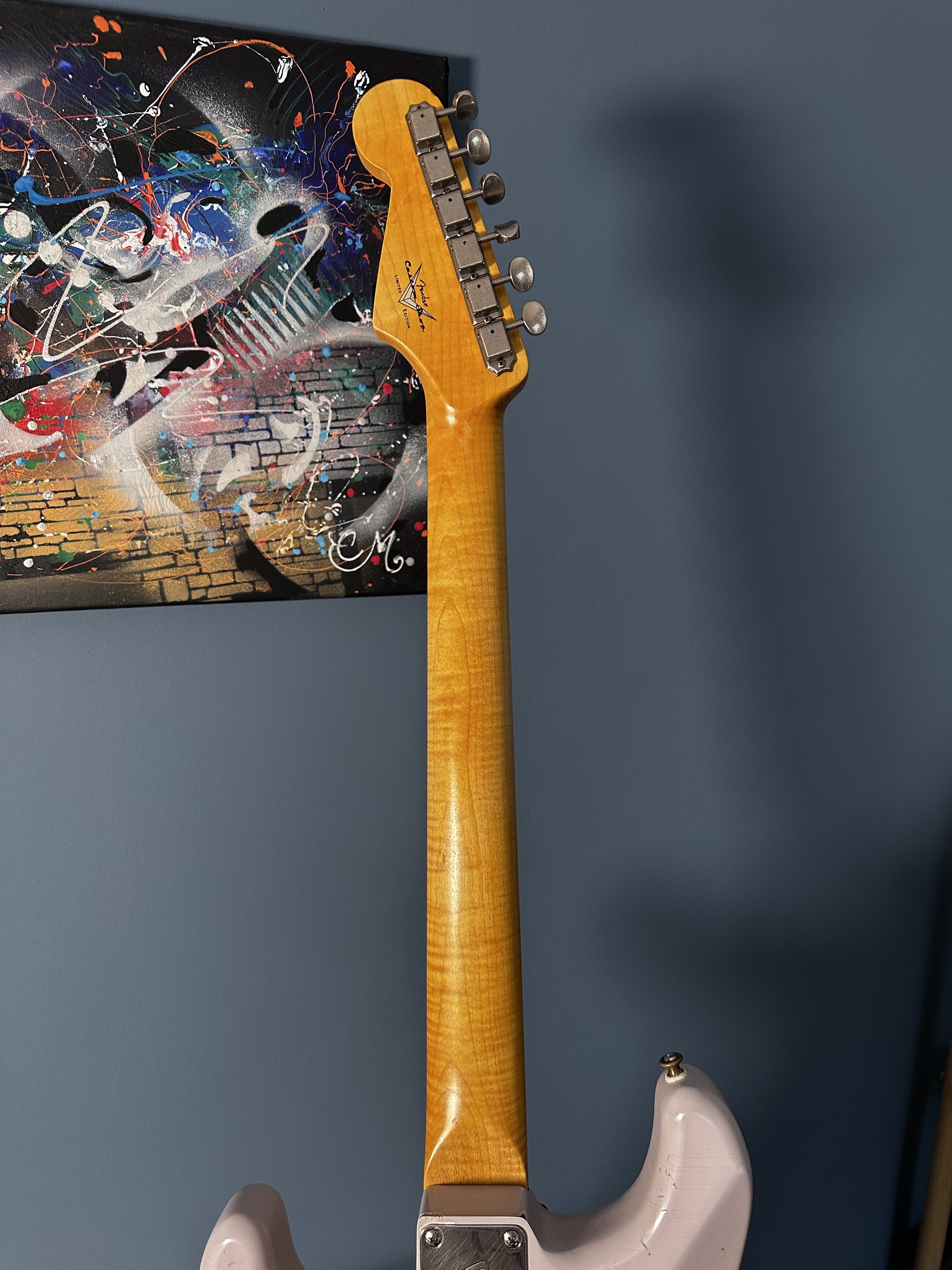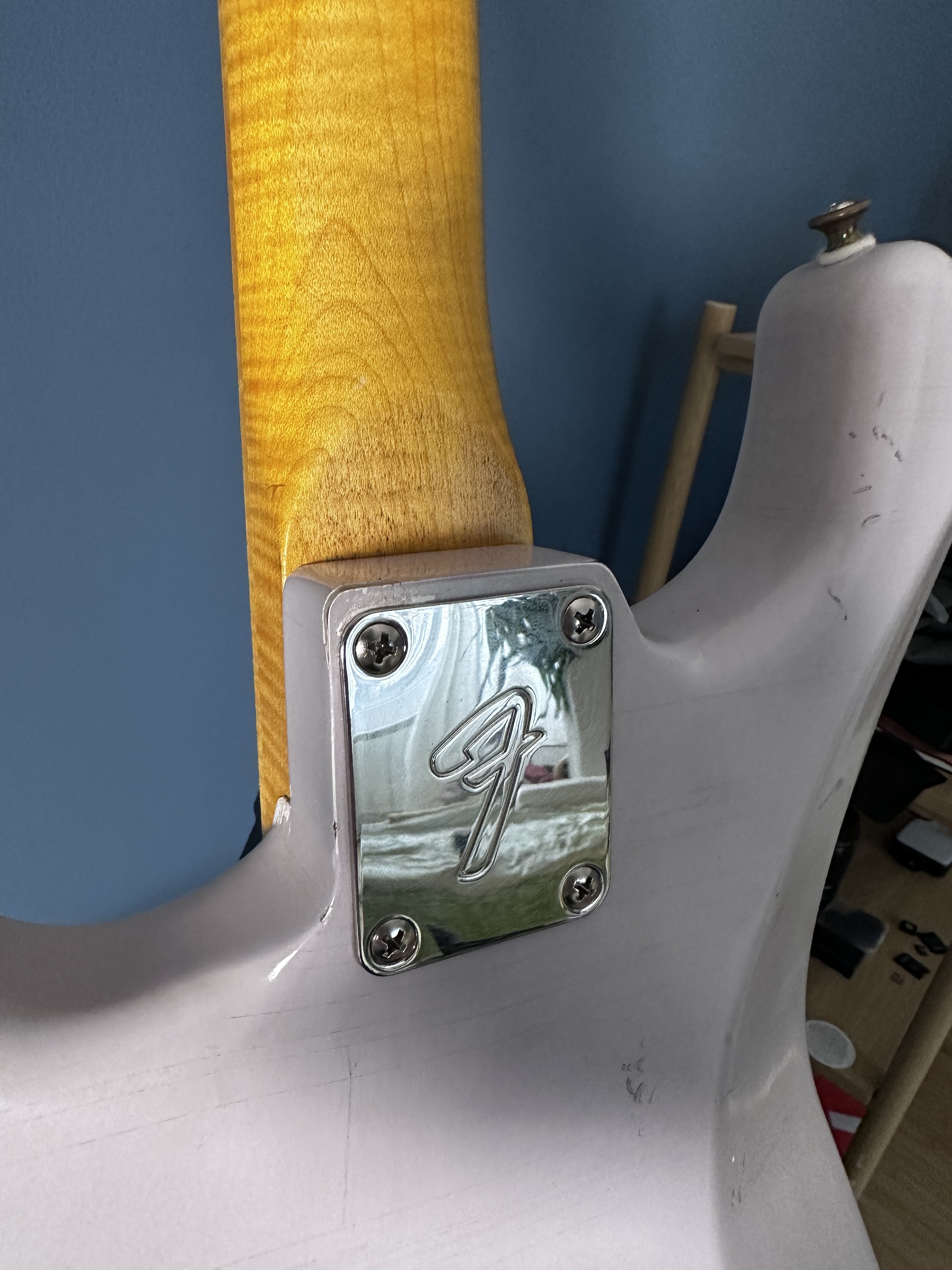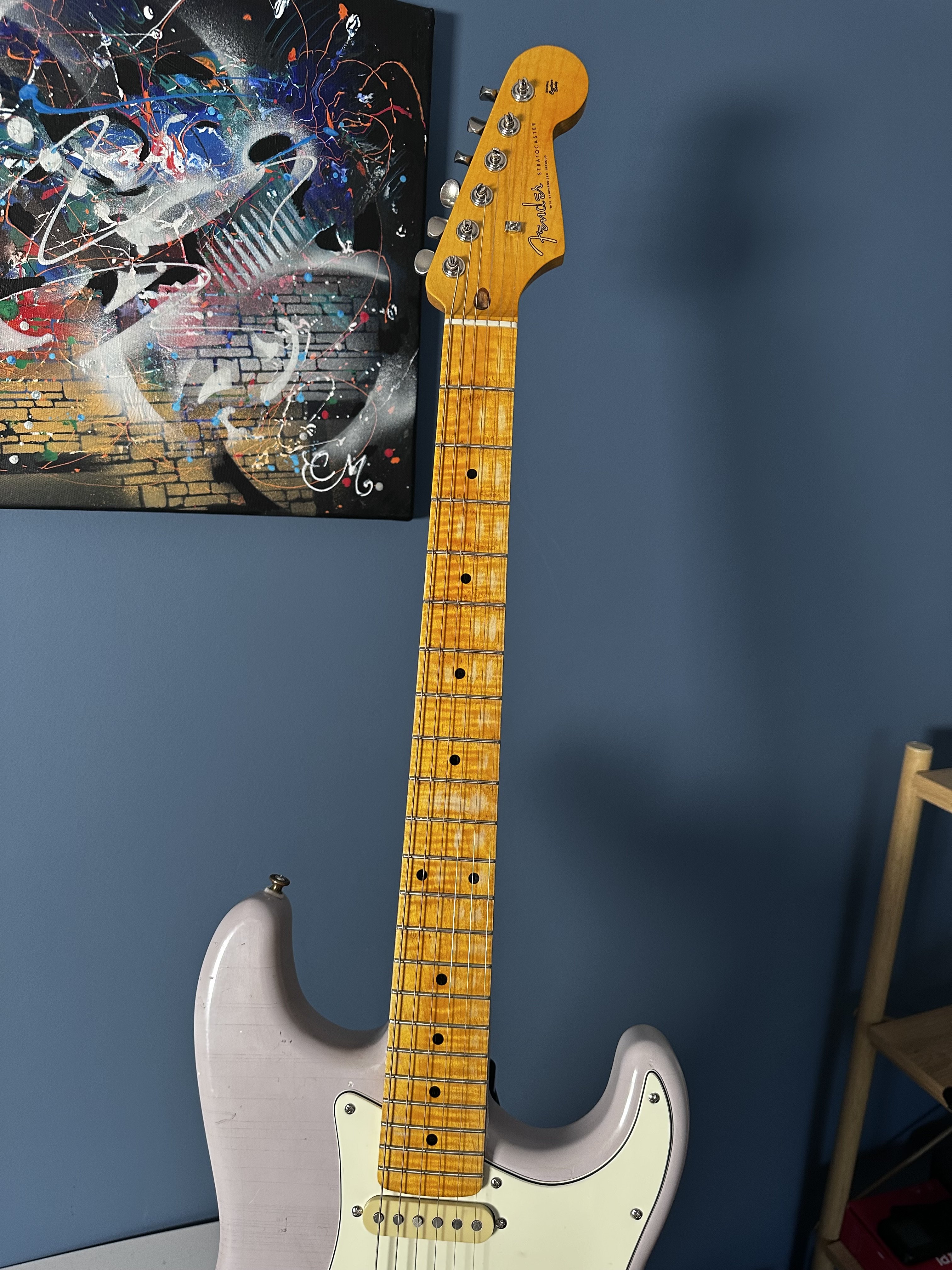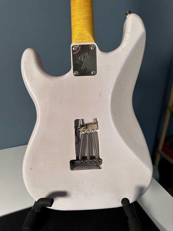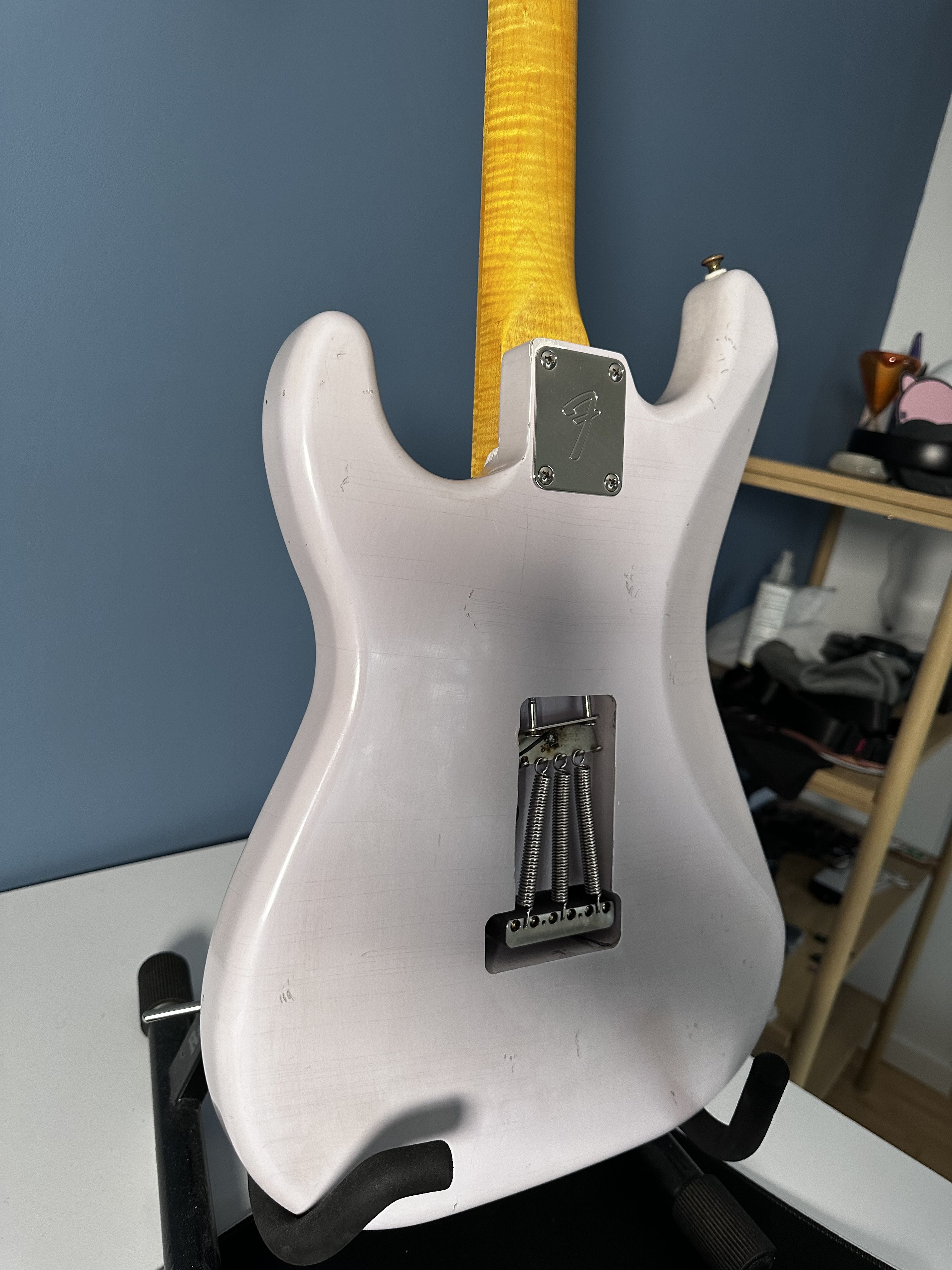 Vând un stratocaster/partcaster deosebit. Culoarea este lila. - corp strat arin (alder) nitro, relic by MJT finishes (Made in USA); - gât flame maple WD music licensed by Fender, nitro, relic, chunky (gros), taste medium, radius 12; - tremolo Gotoh, made in Japan, varianta mai scumpă: 510TS-SF2 - cheițe Fender vintage worn; - neckplate Fender; - doze custom (nu sunt de firmă, dar își fac treaba; dacă vrei ceva de firmă, scrie-mi și vedem ce găsim, prețul va crește însă) Chitara are semne pe tot corpul și pe gât, este relic! Are greutatea de aproximativ 3,4 kg. Sună excelent acustic și amplificată! Prețul componentelor depășește suma pe care o cer eu, nu mai zic de taxe vamale/transport. Nu mă interesează deloc schimburile!6 points