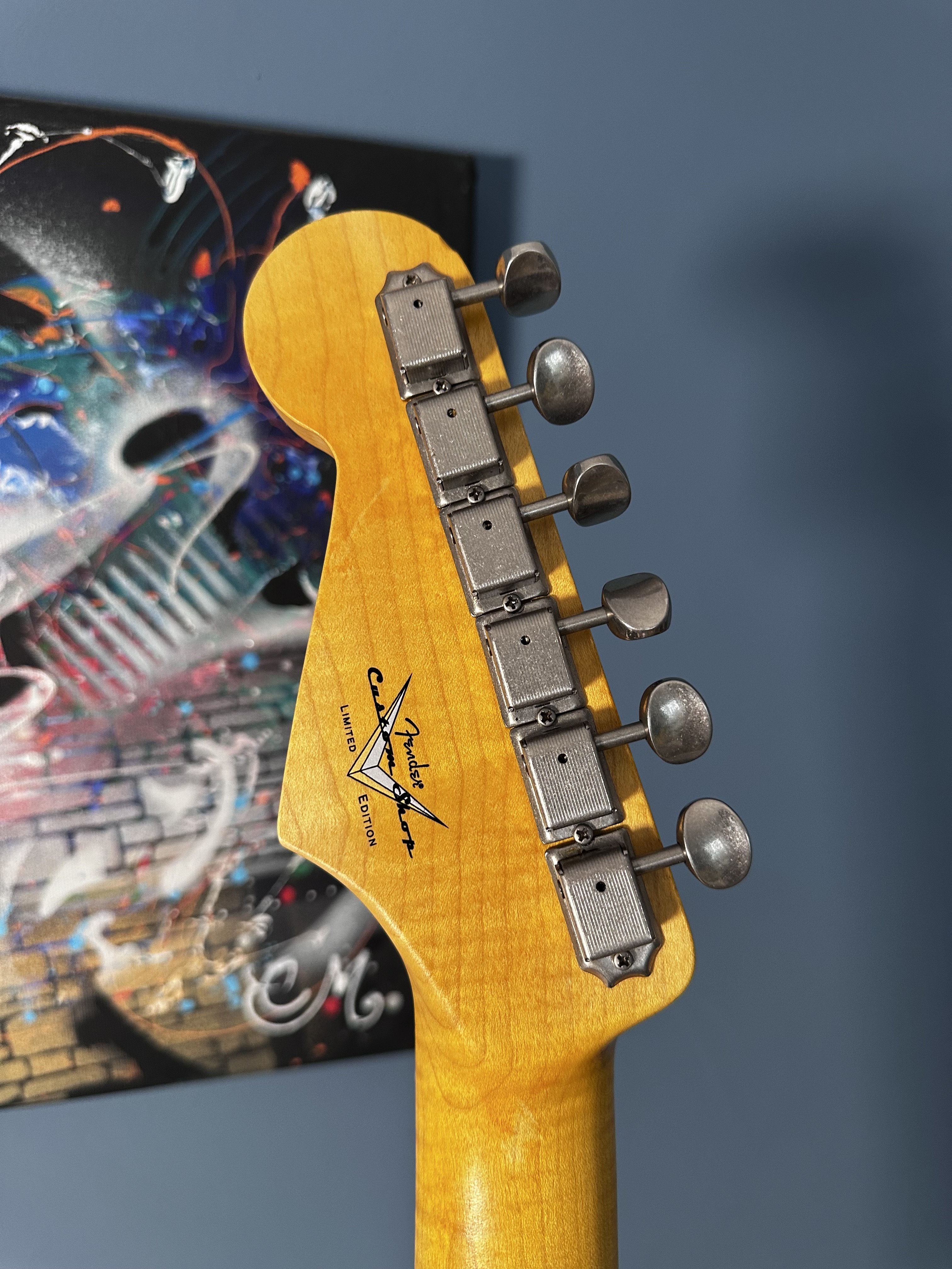Squier / Fender Stratocaster JV ST57-65 Detalii: Neck: Maple/1 piece Oval D profile, profil '57 Fretboard: Maple, 21 frets, 7.25" radius Headstock: Small Pre CBS style Gold Spaghetti Logo 1 Butterfly string tree Body: 2 pieces Ash Tuners: Vintage Style Pickguard: White 8 hole single ply USA Fullerton pickups, 1xVolume; 2xTone; 5-way DM50 switch Greutate: 3.20 kg Chitara este produsa in Japonia in 1983. Face parte din seria de chitare JV, prima serie produsa de Fender in Japonia, renumita pentru nivelul ridicat al calitatii executiei si a componentelor americane utilizate. Aceasta serie a fost comparabila din punct de vedere al caracteristicilor, componentelor si calitatii cu prima serie de modele AVRI produsa de Fender incepand cu 1982. Este si prima data cand brand-ul Squier a fost folosit pentru productia de chitare de catre Fender, nu pentru a indica un model de calitate inferioara ci pentru a diferentia chitarele destinate exportului de piata domestica japoneza (pentru export au folosit brand-ul Squier). Daca mai doriti detalii cu privire la istoria acestei serii va pot transmite multe, am avut cateva modele din aceasta serie si toate au fost excelente. Este produsa in baza modelului 1957, astfel, profilul gatului respecta configuratia istorica, tipul tastelor respecta conformarea tastelor vintage, headstock-ul este cel pre-CBS, conturul corpului la fel, pozitionarea suruburilor pickguard-ului cat si tipul materialului din care e confectionat. Chitara este perfect functionala. Este foarte usoara, rezonanta si are tonul tipic de Stratocaster vintage. Prezinta cateva defecte estetice ce se pot regasi in fotografii insa nimic ce ii afecteaza functionalitatea. Avand in vedere ca un model AVRI din perioada 1982-1984 costa peste 4000 euro, iar aceasta are aceleasi specificatii istorice si doze (nu au potentiometre CTS, condensatorii si jack-ul seriei AVRI), pretul este mai mult decat decent. Are instalat acum un switch Freeway insa switch-ul DM-50 va fi instalat o data cu vanzarea. Vine insotita de hardcase Fender.2 points