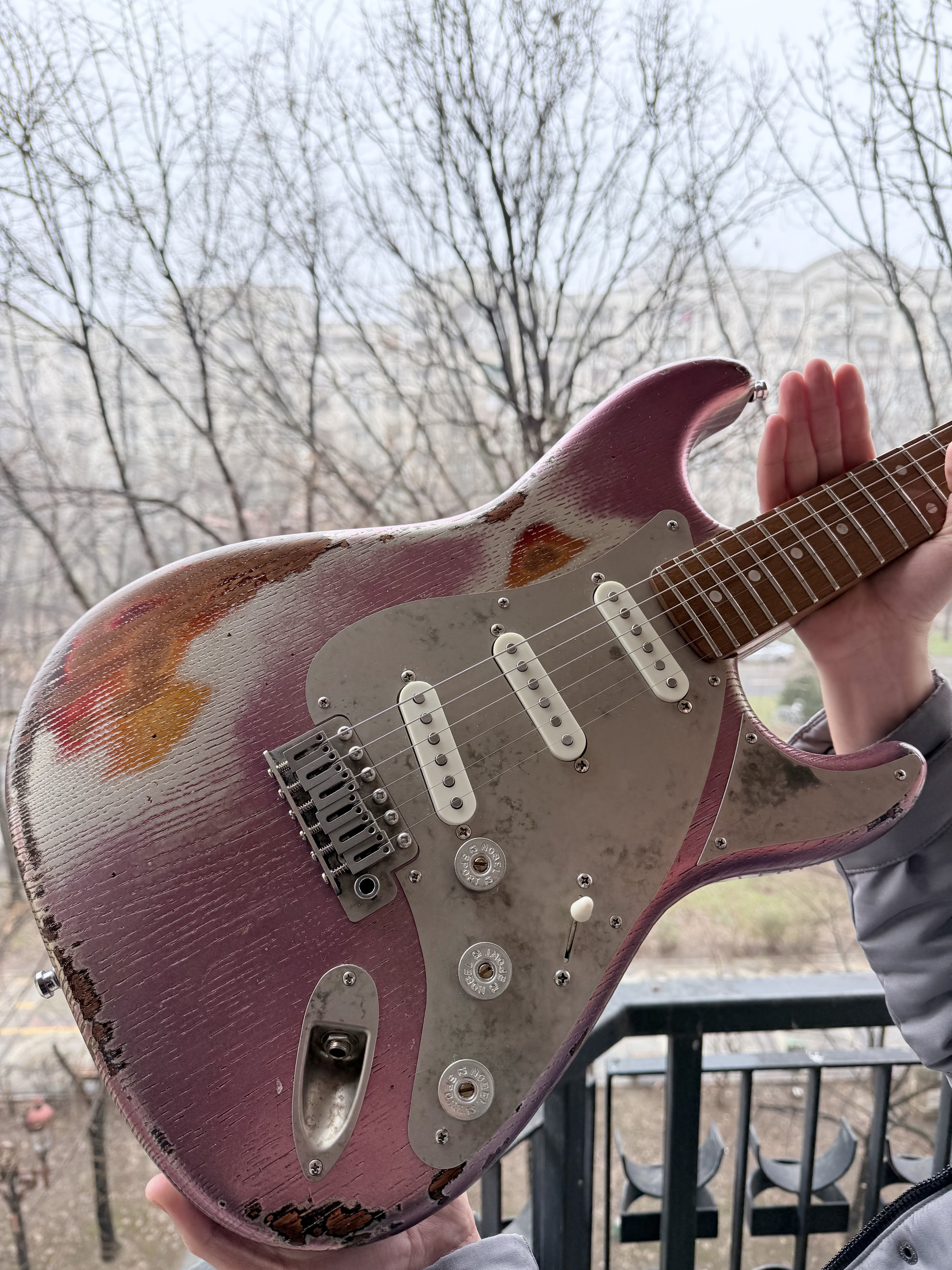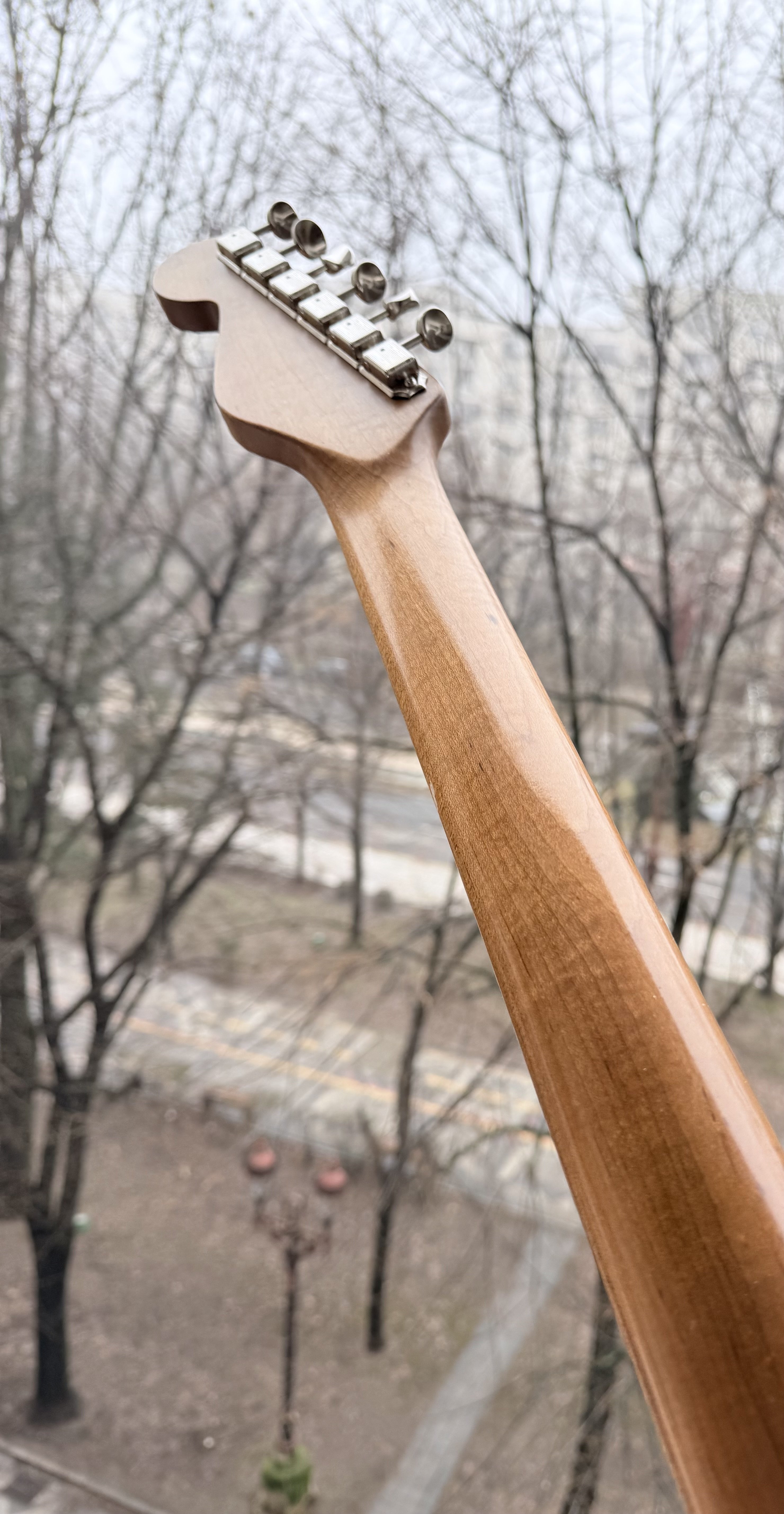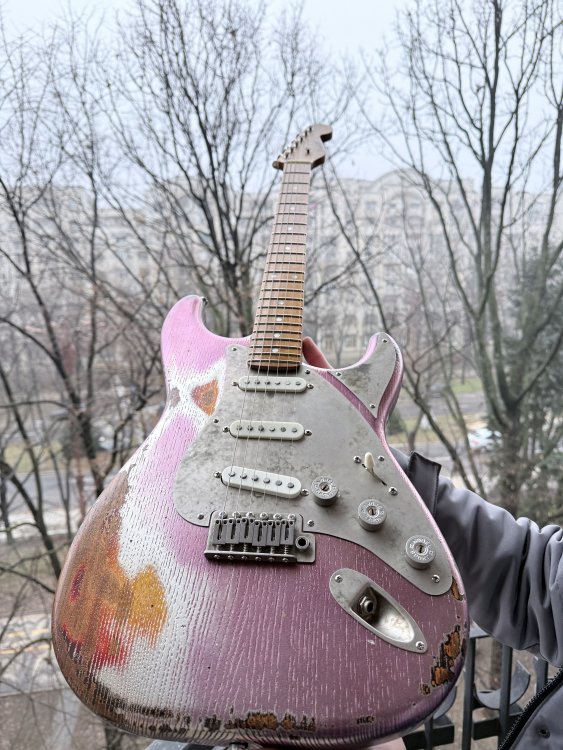 Vând un stratocaster/partcaster deosebit. Culoarea este lila. - corp strat arin (alder) nitro, relic by MJT finishes (Made in USA); - gât flame maple WD music licensed by Fender, nitro, relic, chunky (gros), taste medium, radius 12; - tremolo Gotoh, made in Japan, varianta mai scumpă: 510TS-SF2 - cheițe Fender vintage worn; - strap lock pins; - neckplate Fender; - doze custom (nu sunt de firmă, dar își fac treaba; dacă vrei ceva de firmă, scrie-mi și vedem ce găsim, prețul va crește însă) Chitara are semne pe tot corpul și pe gât, este relic! Are greutatea de aproximativ 3,4 kg. Sună excelent acustic și amplificată! Prețul componentelor depășește suma pe care o cer eu, nu mai zic de taxe vamale/transport. Nu mă interesează deloc schimburile!3 points