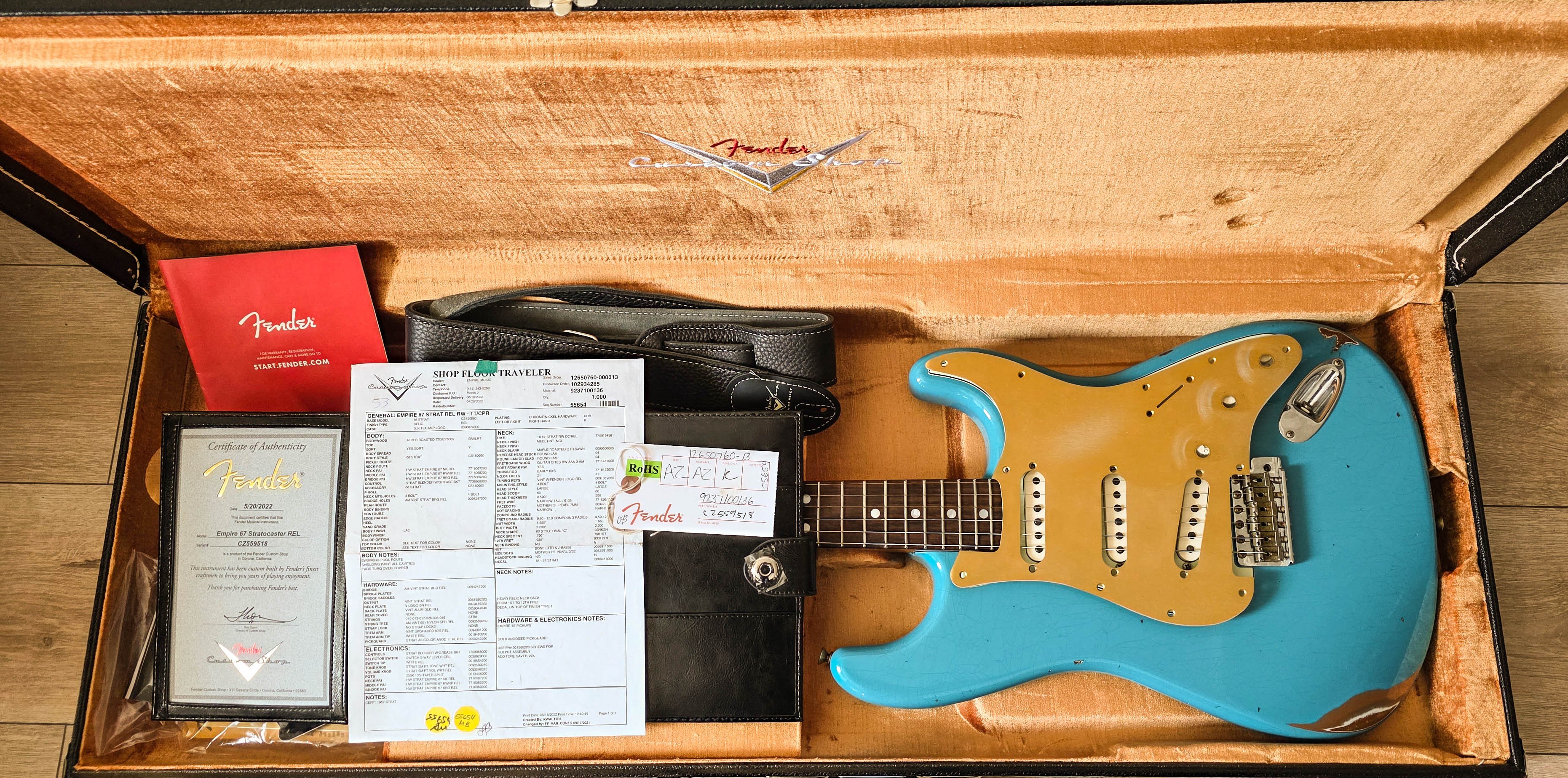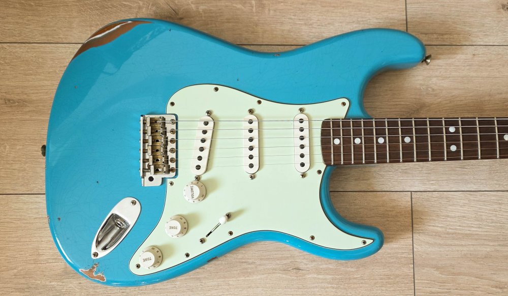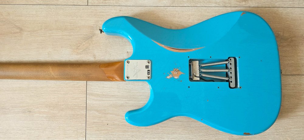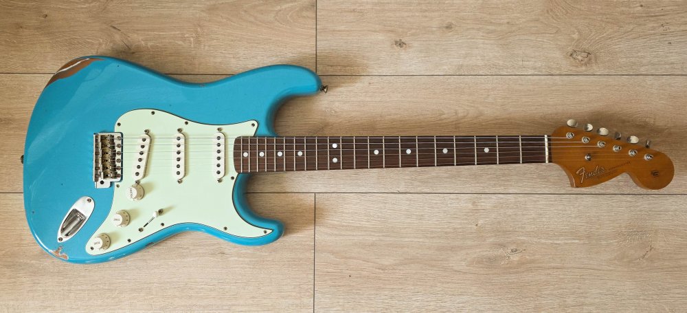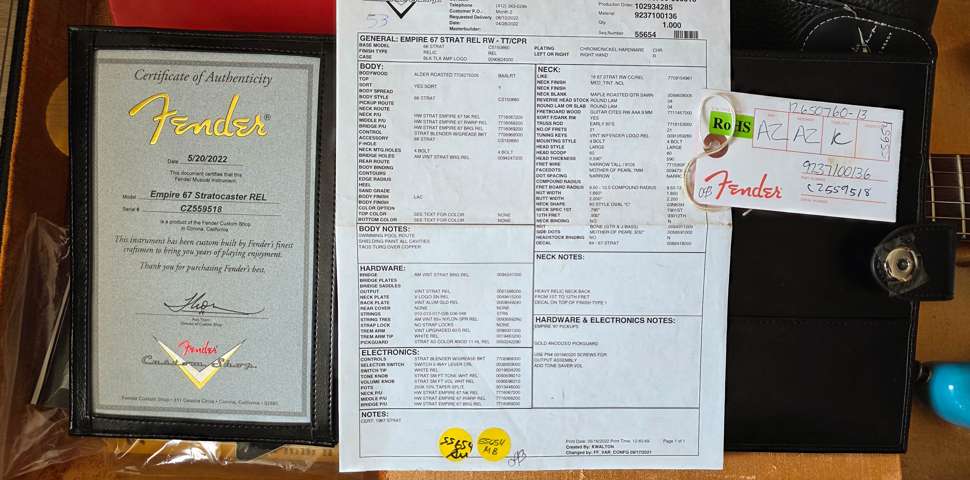 Fender Custom Shop Empire 67 Strat Taos Turquoise over Gold este o editie speciala facuta la specificatiile unui dealer in anul 2022. Vine cu specificatii "alese" de Empire Music, respectiv roasted alder body, roasted oval C mid 60's maple neck with slab rosewood si radius compound 9.5-12, doze handwired si culoarea speciala relic taos turquoise over Gold, un finish greu de replicat, cu 2 straturi de culoare suprapuse. Chitara este super rezonanta, si suna exceptional, asa cum trebuie sa sune un strat peste care au trecut multi ani. Pickguardul a fost schimbat cu unul mint green din motive de preferinte, dar originalul este si el inclus in case. Are tot cu ce a venit, certificat, hardcase original si case candy, si este cat se poate de mint condition cat poate fi un medium relic ... Modelul actual, care nu mai este culoare peste culoare costa 5000 USD, plus shipping si taxe vamale si TVA, adica undeva in jurul a 6000 euro probabil. Eu doresc pe a mea 3200 euro. Nu doresc schimburi decat daca sunt super avantajoase pentru mine, dar nu o sacosa de pedale si 3 microfoane si mai stiu eu ce. https://empiremusic.com/products/fender-custom-shop-empire-67-stratocaster-relic-3-color-sunburst-82401?srsltid=AfmBOorj4gU469FqEBSxsrGP8Mgb3eoOLjsF5d957SlIEC-VoxyuPviU Contact 0731 444 6462 points