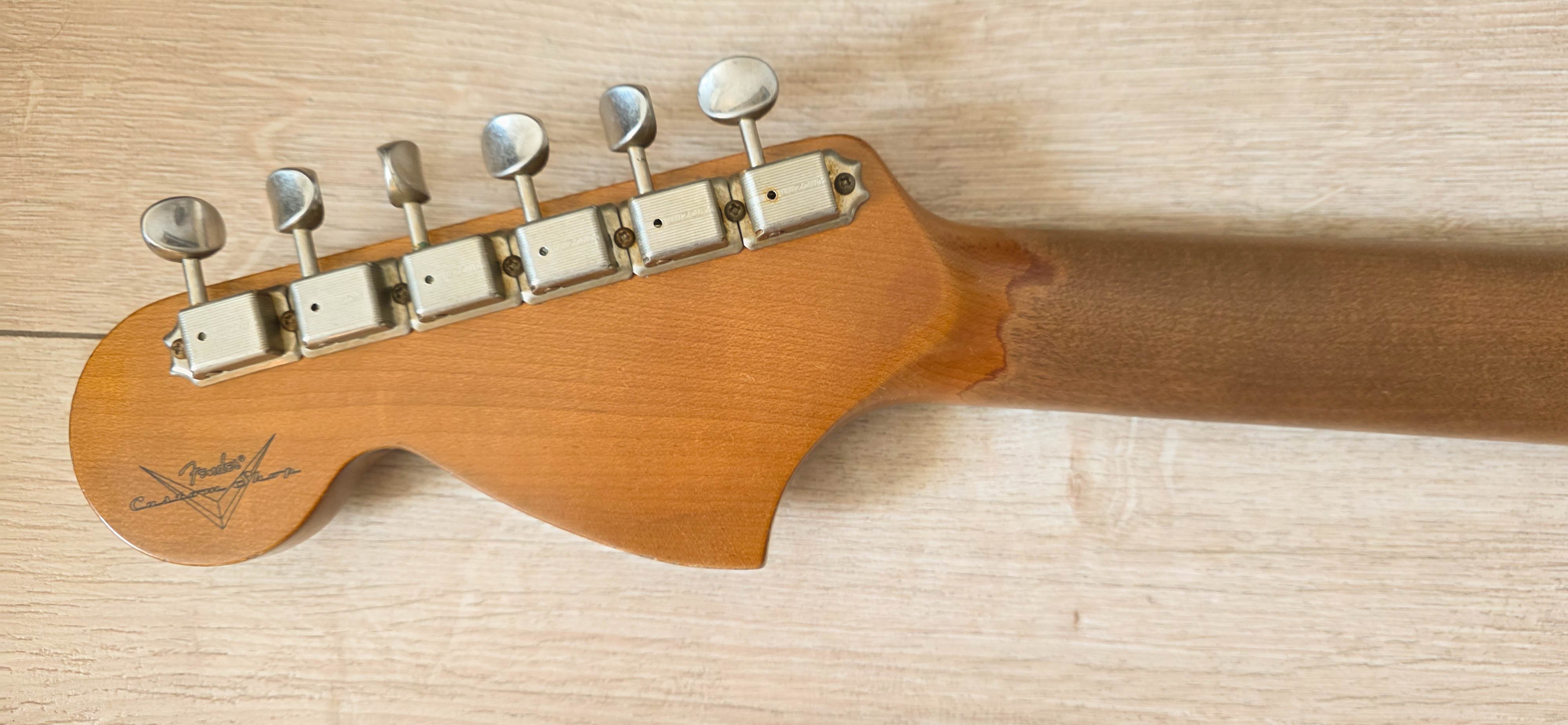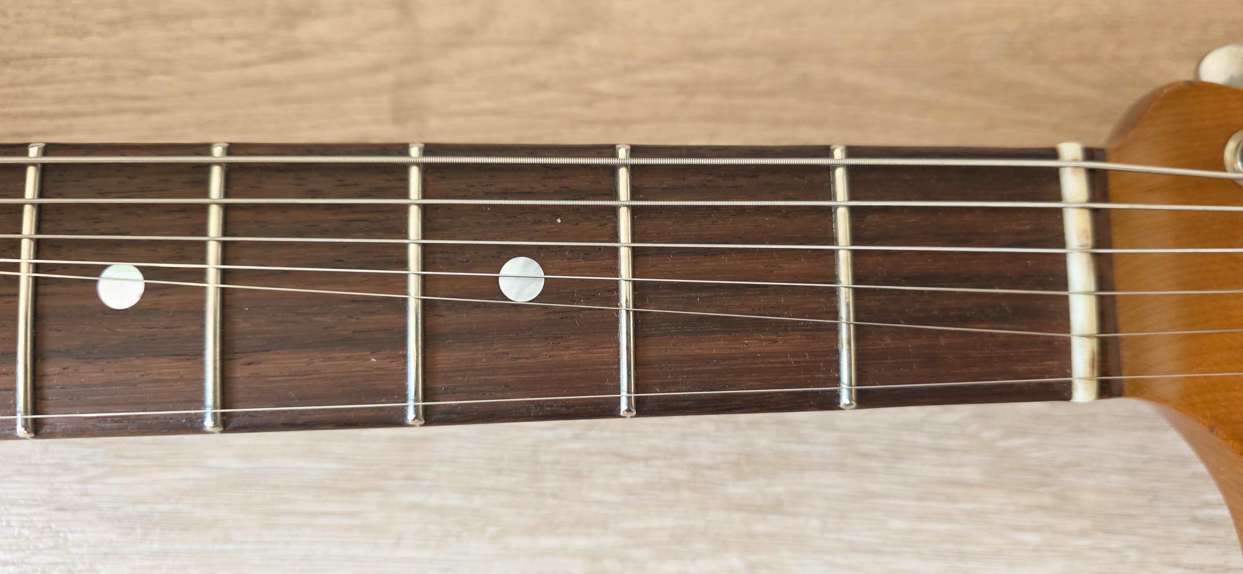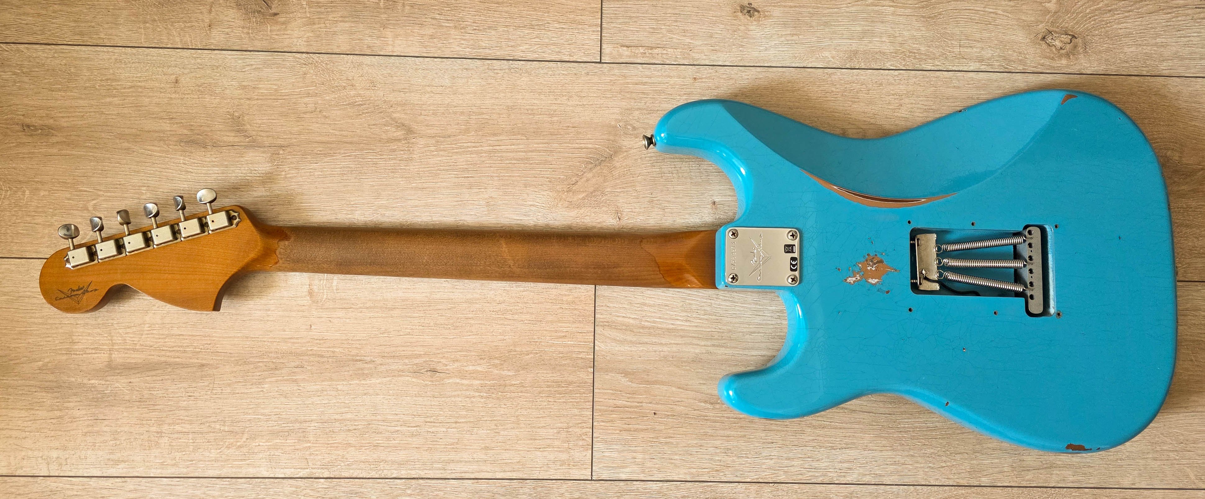 Fender Custom Shop Empire 67 Strat Taos Turquoise over Gold este o editie speciala facuta la specificatiile unui dealer in anul 2022. Vine cu specificatii "alese" de Empire Music, respectiv roasted alder body, roasted oval C mid 60's maple neck with slab rosewood si radius compound 9.5-12, doze handwired si culoarea speciala relic taos turquoise over Gold, un finish greu de replicat, cu 2 straturi de culoare suprapuse. Chitara este super rezonanta, si suna exceptional, asa cum trebuie sa sune un strat peste care au trecut multi ani. Pickguardul a fost schimbat cu unul mint green din motive de preferinte, dar originalul este si el inclus in case. Are tot cu ce a venit, certificat, hardcase original si case candy, si este cat se poate de mint condition cat poate fi un medium relic ... Modelul actual, care nu mai este culoare peste culoare costa 5000 USD, plus shipping si taxe vamale si TVA, adica undeva in jurul a 6000 euro probabil. Eu doresc pe a mea 3200 euro. Nu doresc schimburi decat daca sunt super avantajoase pentru mine, dar nu o sacosa de pedale si 3 microfoane si mai stiu eu ce. https://empiremusic.com/products/fender-custom-shop-empire-67-stratocaster-relic-3-color-sunburst-82401?srsltid=AfmBOorj4gU469FqEBSxsrGP8Mgb3eoOLjsF5d957SlIEC-VoxyuPviU Contact 0731 444 6462 points