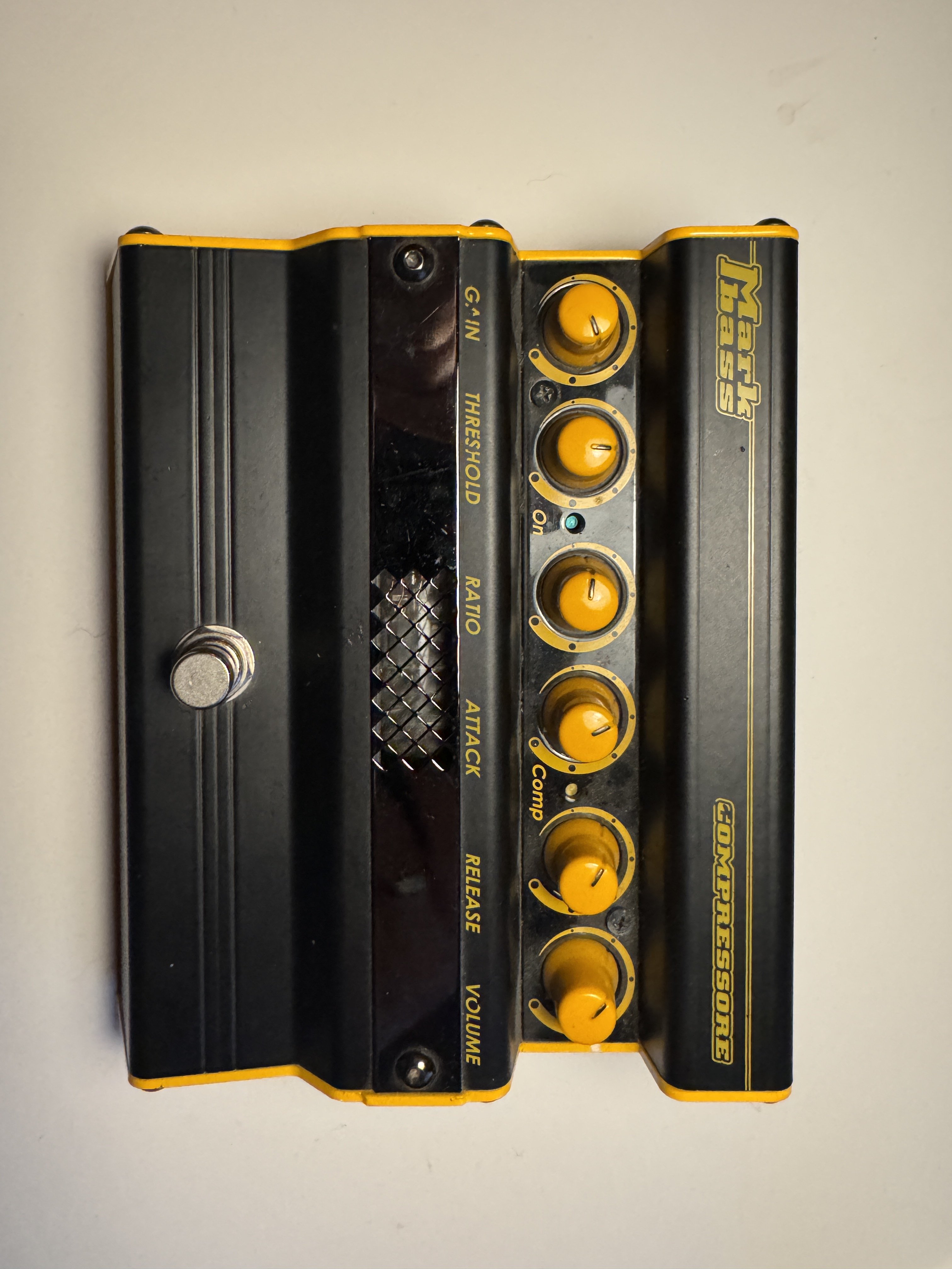 1. Markbass compressore este o pedală de compresie cu lampă. Este primul model, și e mai ok decât următorul pentru ca butoanele sunt gândite să stea cum le așezi, să nu se strice setările când închizi sau pui un cablu în pedalier. O am de mult mulți ani, dar a stat mai mult degeaba, de asta vreau să o și dau. Doar București, se poate testa la Flaros. Vine cu alimentarea proprie.