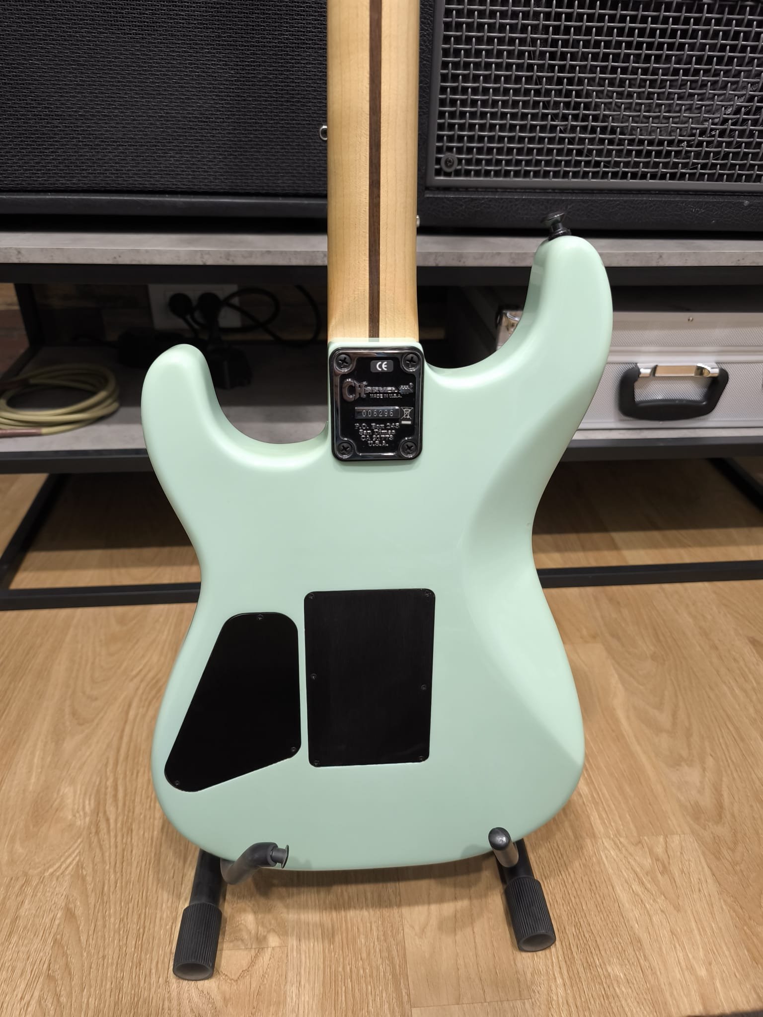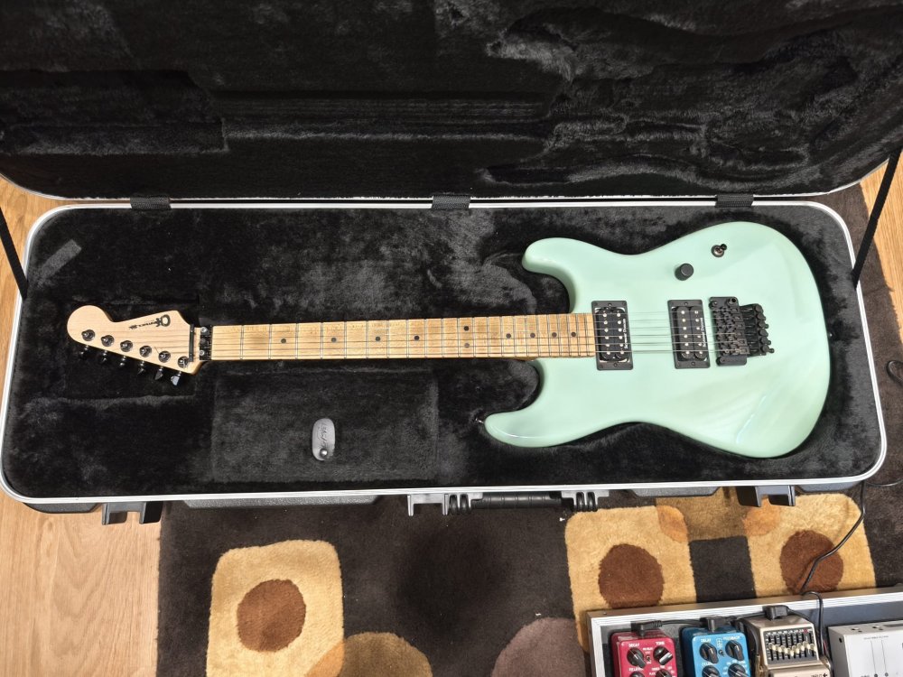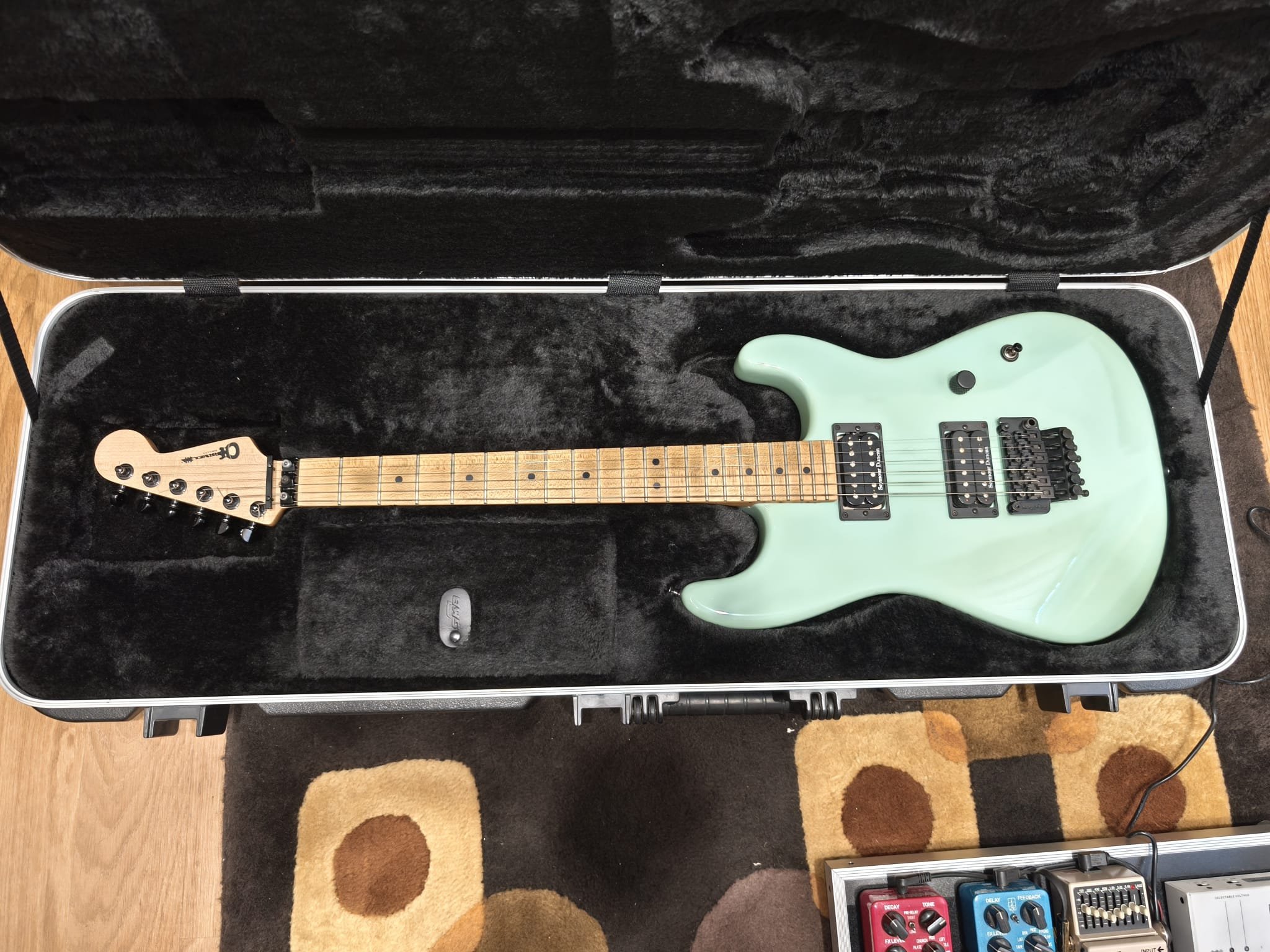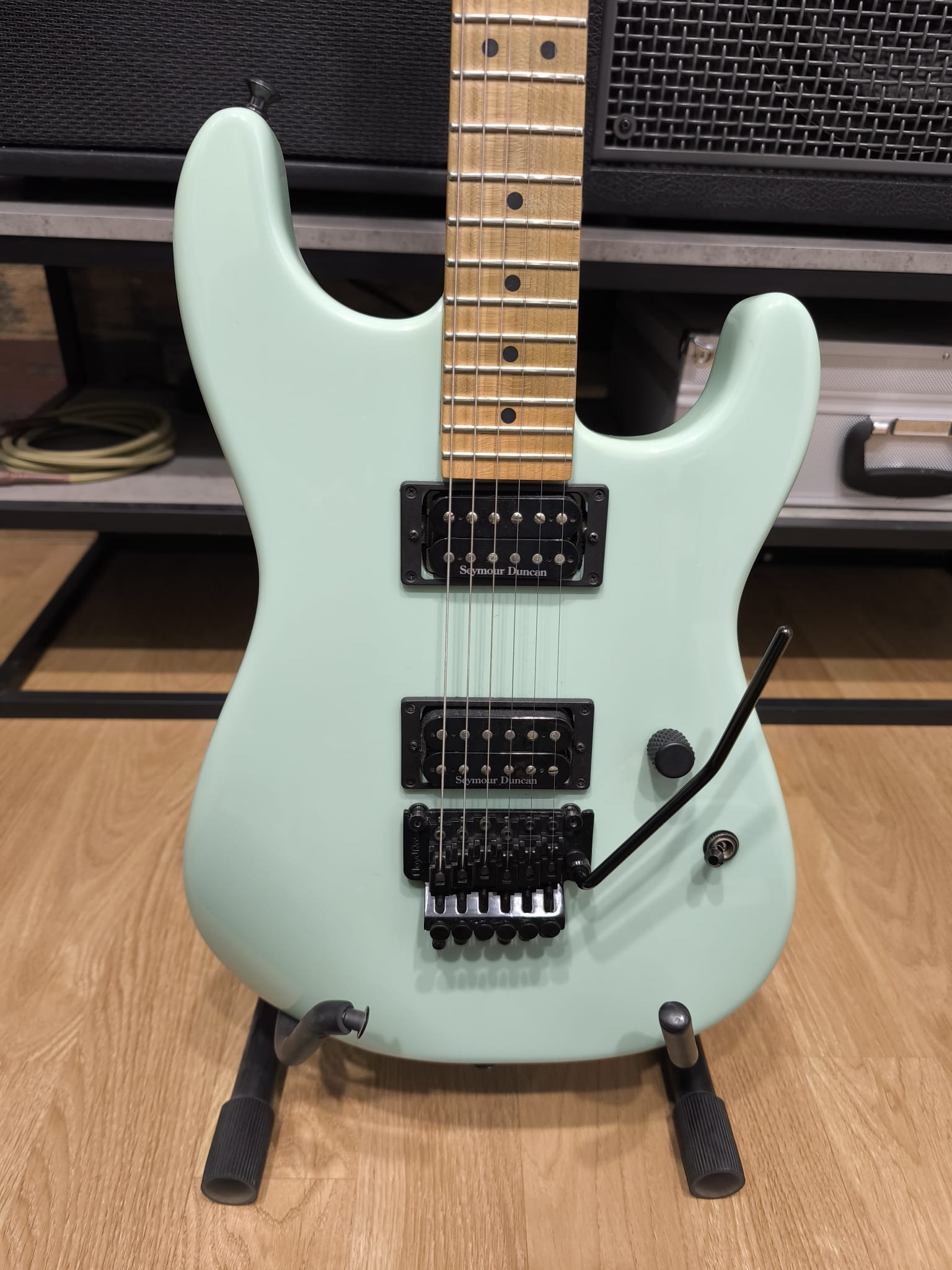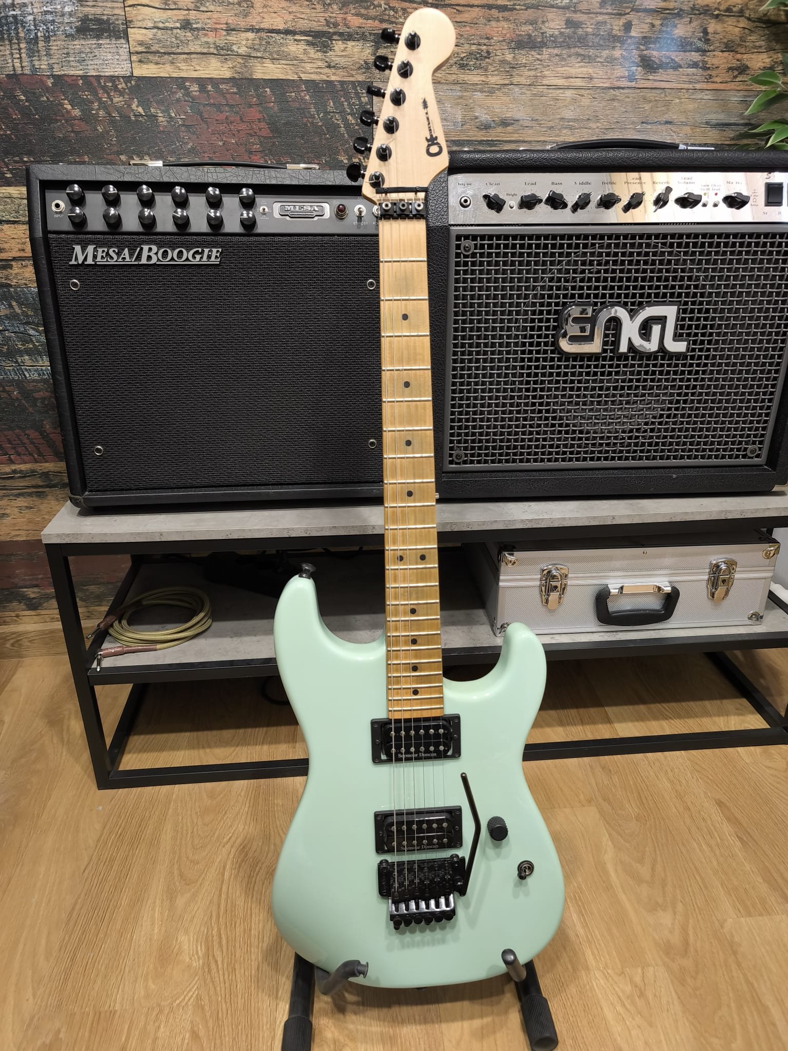 Charvel San Dimas USA intr-o culoare rara Sea Seek Green cu totul original pe ea. Model Name: San Dimas® Style 1 - 2H Series: U.S.A Production Model Body: 3-Piece Alder Neck: Bolt-On 1-Piece Quartersawn Eastern Hardrock Maple with Natural Oiled Finish Fingerboard: Maple with 12” to 16” Compound Radius No. of Frets: 22 Jumbo Dunlop® 6100 Scale Length: 25.5" (648 mm) Width @ Nut: 1.6875” (43 mm) Hardware: Black Machine Heads: Grover® Mini RotomaticTM Die-Cast Tuners Bridge: Floyd Rose® FRT-O2000 Double Locking 2-Point Tremolo Bridge Pickup: Seymour Duncan® TB4 ( JB )Humbucking Pickup Middle Pickup: N/A Neck Pickup: Seymour Duncan® SH1N ( 59 ) Humbucking Pickup Pickup Switching: 3-Position Toggle: Position 1. Bridge Pickup Position 2. Bridge and Neck Pickups Position 3. Neck Pickup Controls: Master Volume Colors: Sea Seek Green (Polyester Finish) Strings: D’Addario NPS, Gauges: .009, .011, .016, .024, .032, .042 Unique Features: One piece Quartersawn Hard Rock Maple Neck, Classic San Dimas® Neck Backshape, Original Black Charvel® Headstock Logo, Schaller® Bar String Retainer, Black Dot Position Inlays, 12” – 16” Compound Radius Fingerboard, Floyd Rose® #R3 Locking Nut, Dunlop® Strap Buttons, Brushed Black Anodized Aluminum Back Plates, Knurled Black Control Knob, Side Mounted Oval Input Jack Source: US 2008-2010 Se vinde in SKB - ul original . Chitara se prezinta in conditie foarte buna si nu are nici o probleme de ordin tehnic sau majora estetic. Pentru cei interesati mesaj pe forum sau la tel. 0747 026758